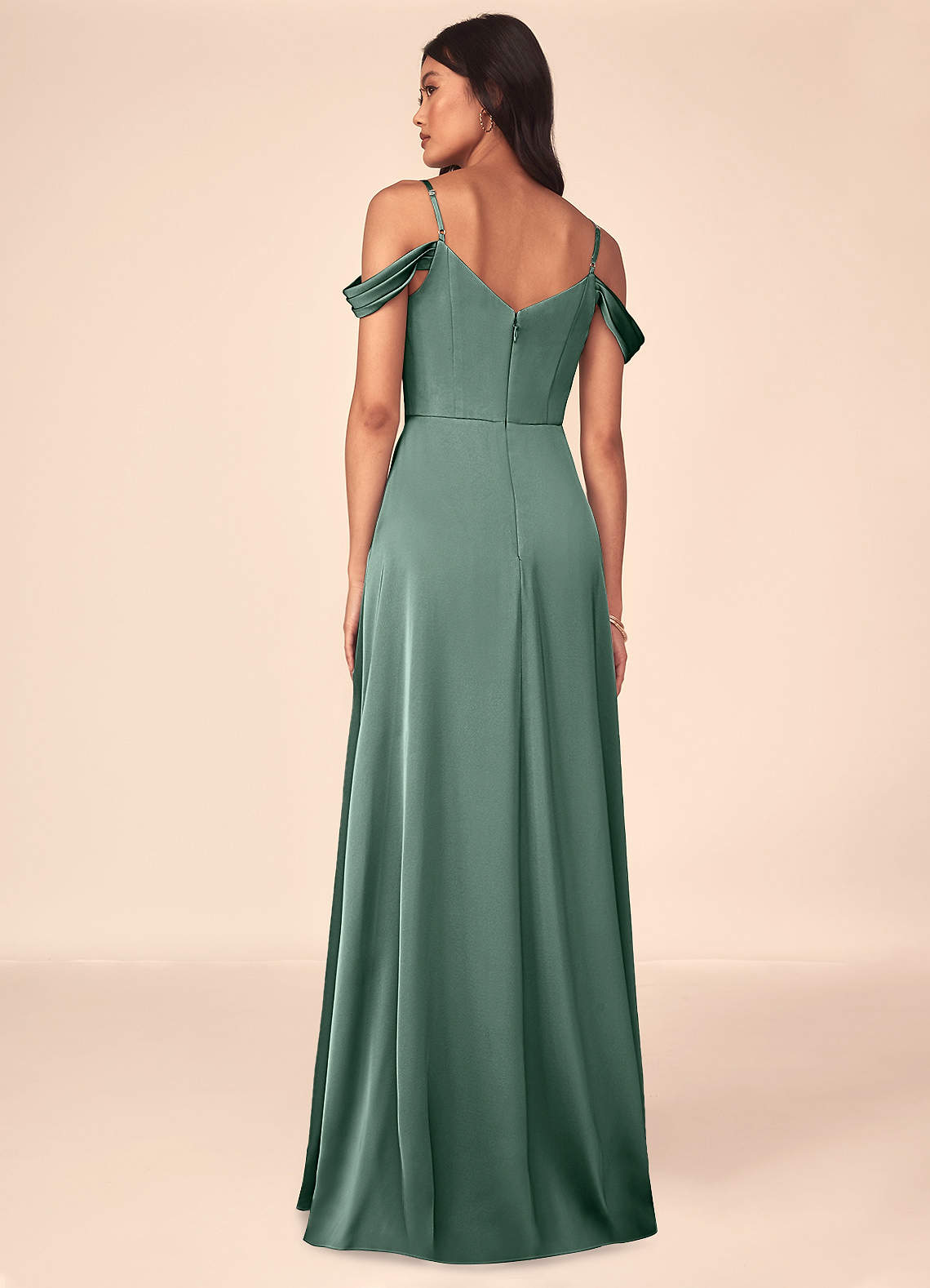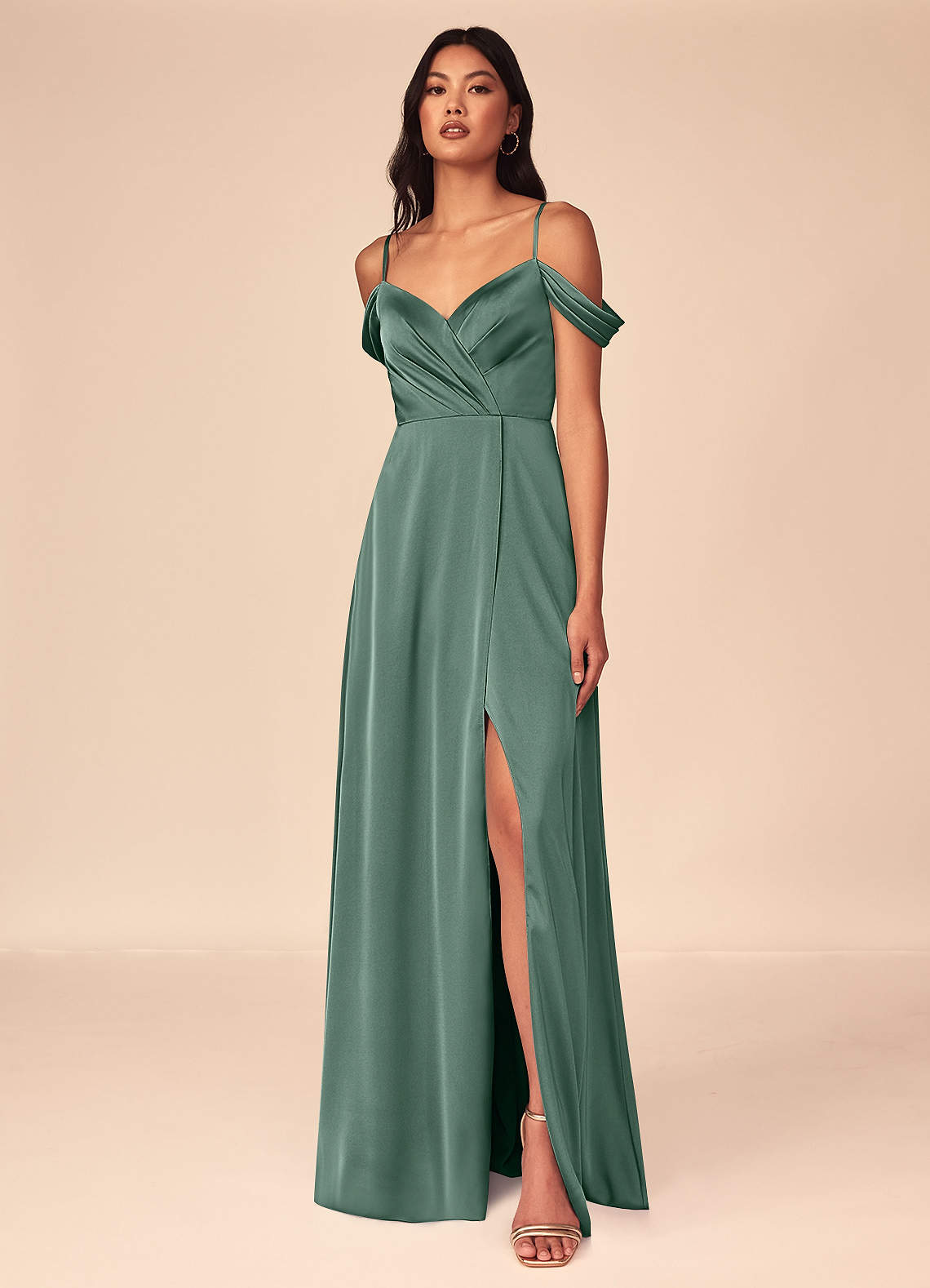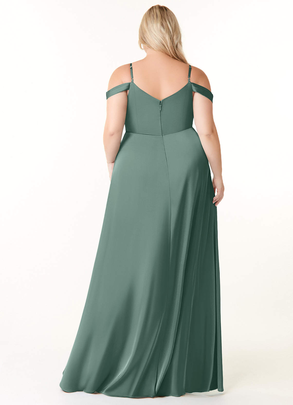 Ocean ist unser elegantes Brautjungfernkleid aus Stretchsatin. Sie hat ein plissiertes Chorhemd mit schulterfreien Ärmeln und Spaghettiträgern. Der Look wird durch einen weichen Rock in A-Linie und einen Beinschlitz abgerundet.