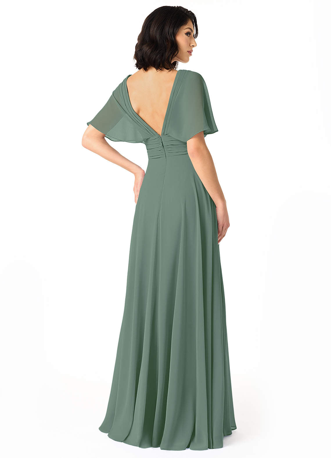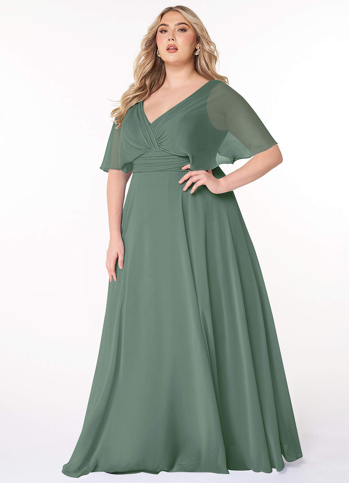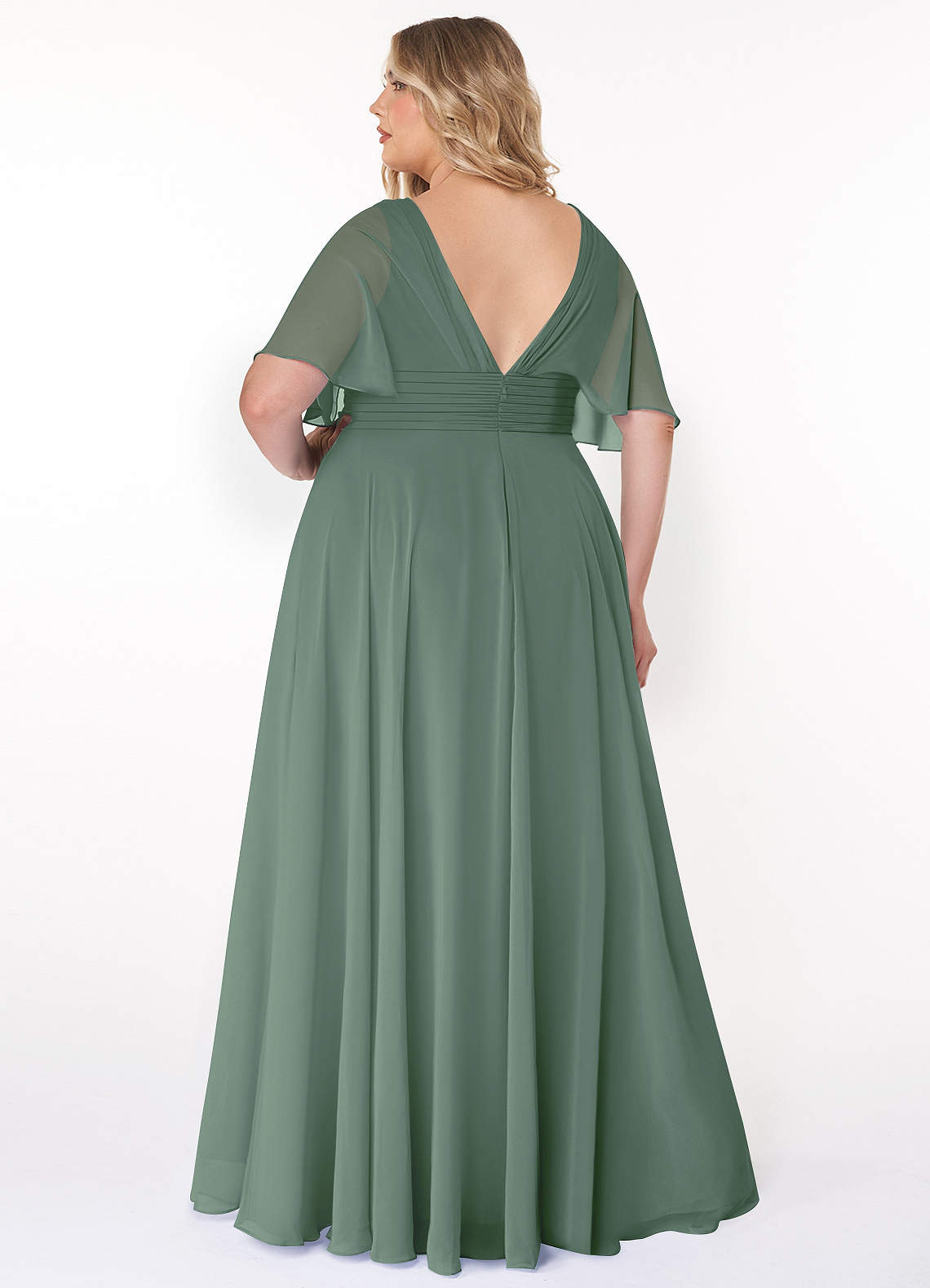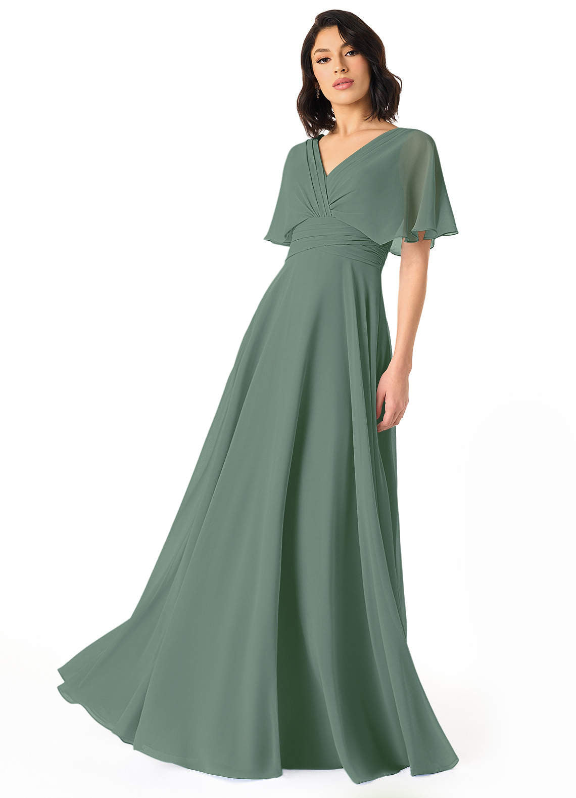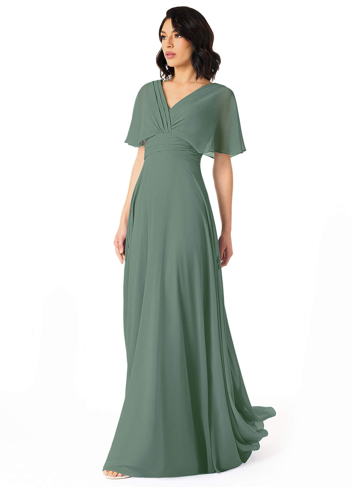 Mit Pamela fühlen Sie sich wie eine griechische Göttin! Die zarten Ärmel reichen bis zu den Ellbogen, während der V-Ausschnitt und das plissierte Oberteil es universell schmeichelhaft machen. Der Rock weitet sich ab der Taille und fällt in einer Kaskade von Falten auf den Boden.