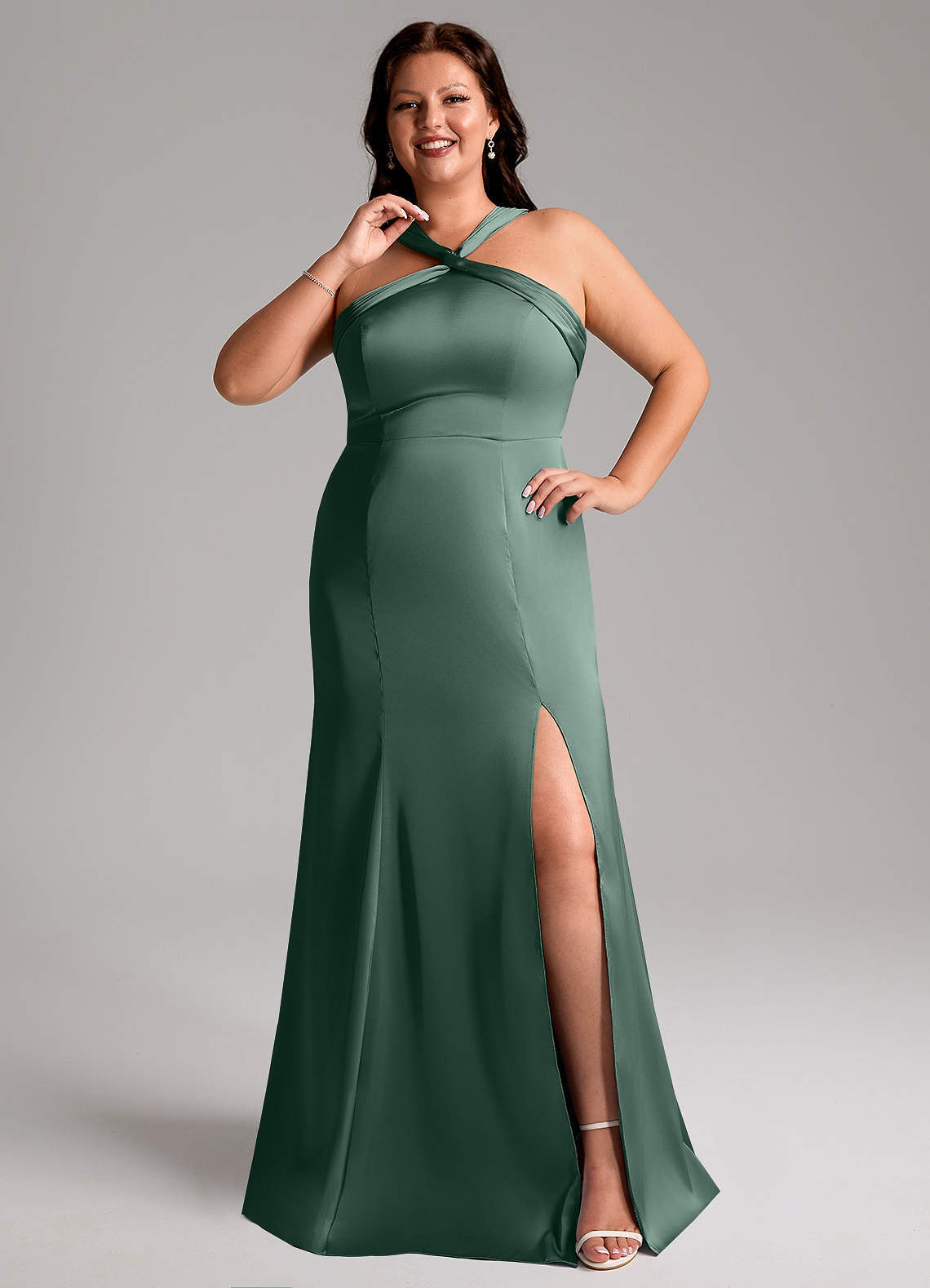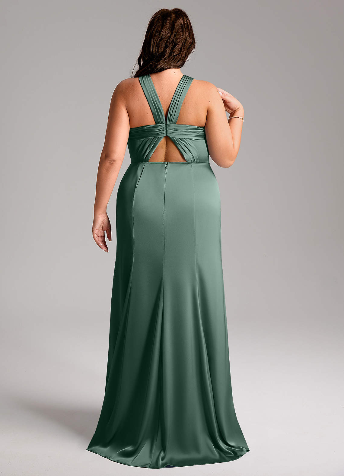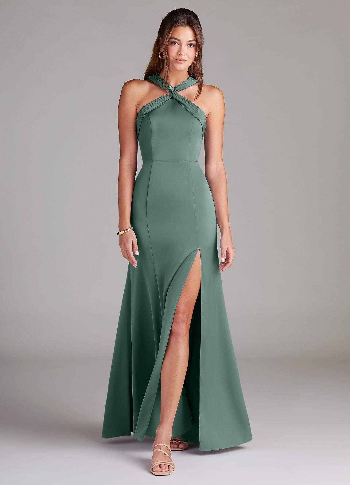 Fühlen Sie sich wie eine griechische mythische Göttin in einem Brautjungfernkleid von Rue. Das Oberteil mit gedrehtem Neckholder-Ausschnitt hat ein Faltendetail, das mit den Trägern verbunden ist. Die Faltenträger laufen mit einem Haken- und Ösenverschluss in der Mitte des Oberteils zusammen und bilden einen Rückenausschnitt. Die bodenlange Meerjungfrauen-Silhouette aus Stretch-Satin ist mit einem Beinschlitz versehen.