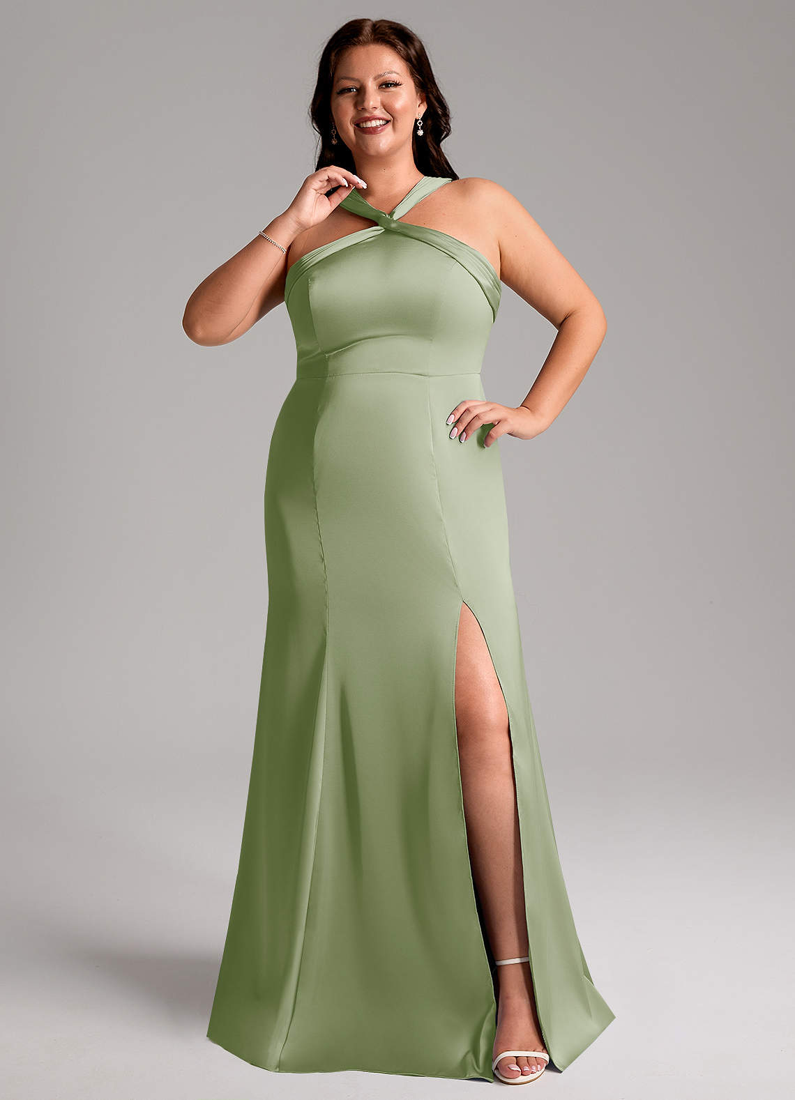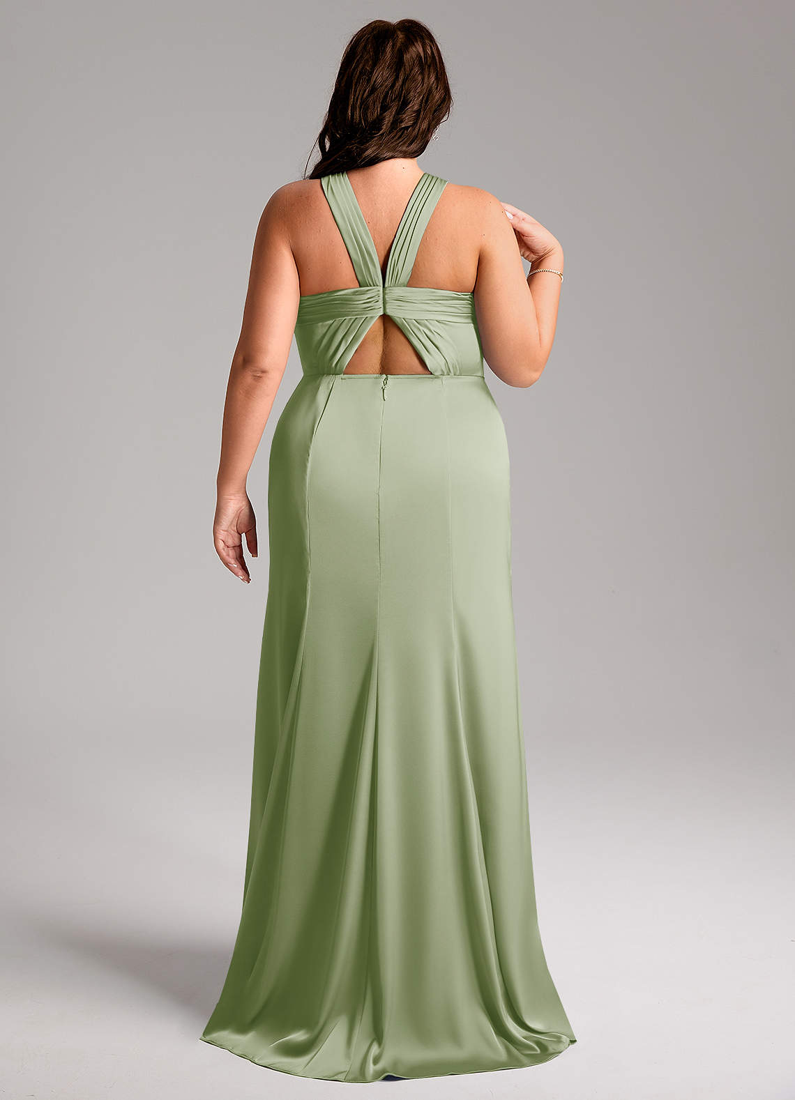 Fühlen Sie sich wie eine griechische mythische Göttin in einem Brautjungfernkleid von Rue. Das Oberteil mit gedrehtem Neckholder-Ausschnitt hat ein Faltendetail, das mit den Trägern verbunden ist. Die Faltenträger laufen mit einem Haken- und Ösenverschluss in der Mitte des Oberteils zusammen und bilden einen Rückenausschnitt. Die bodenlange Meerjungfrauen-Silhouette aus Stretch-Satin ist mit einem Beinschlitz versehen.