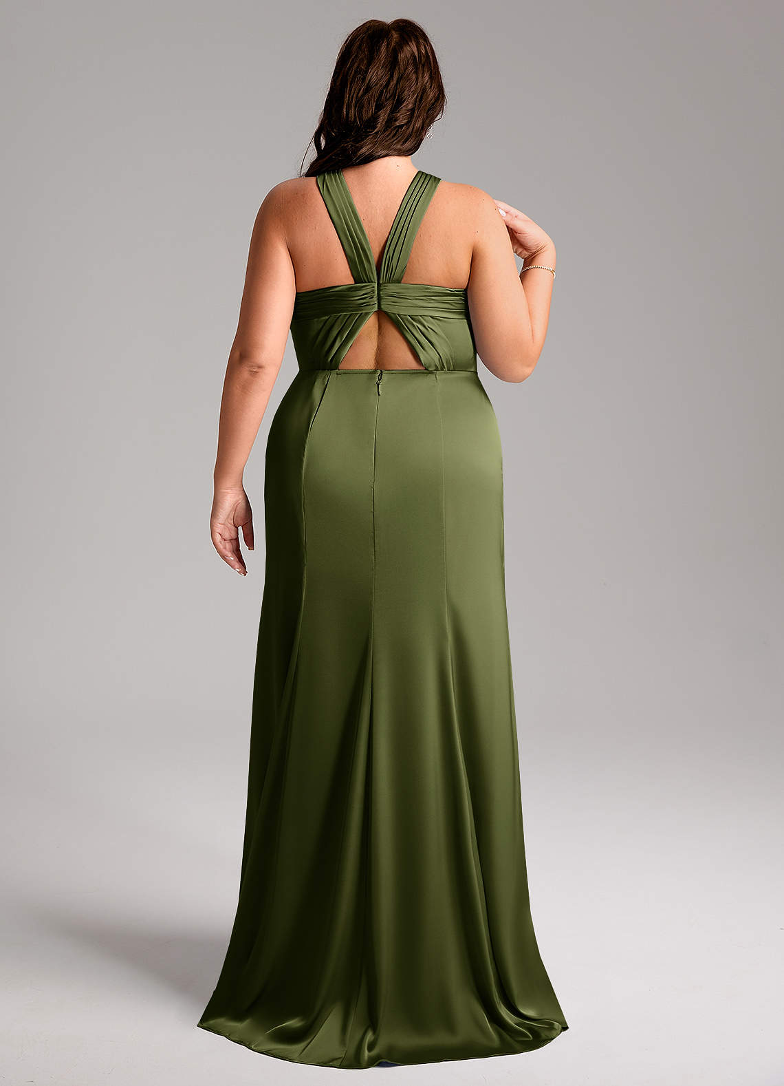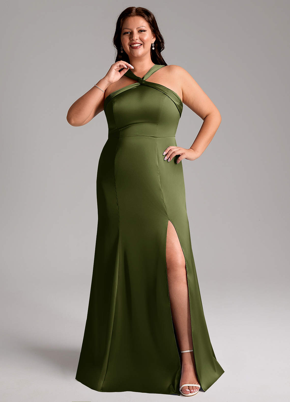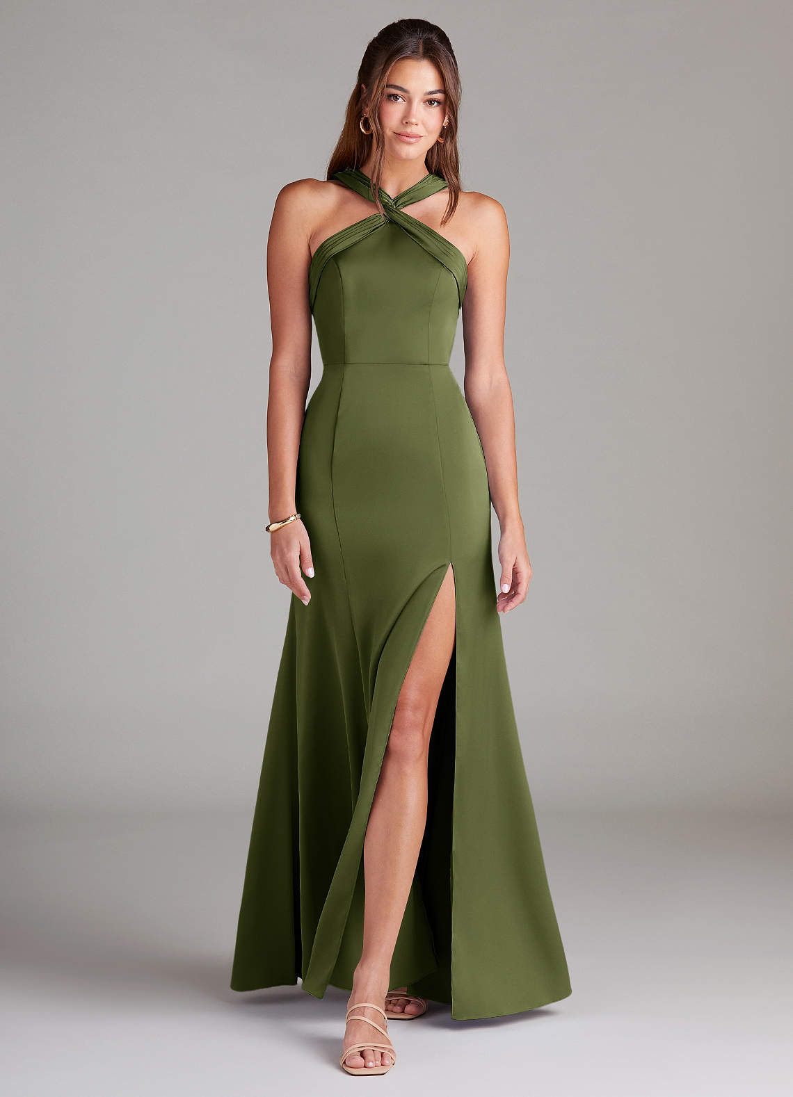 Fühlen Sie sich wie eine griechische mythische Göttin in einem Brautjungfernkleid von Rue. Das Oberteil mit gedrehtem Neckholder-Ausschnitt hat ein Faltendetail, das mit den Trägern verbunden ist. Die Faltenträger laufen mit einem Haken- und Ösenverschluss in der Mitte des Oberteils zusammen und bilden einen Rückenausschnitt. Die bodenlange Meerjungfrauen-Silhouette aus Stretch-Satin ist mit einem Beinschlitz versehen.