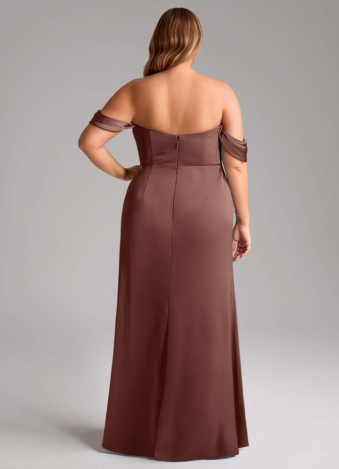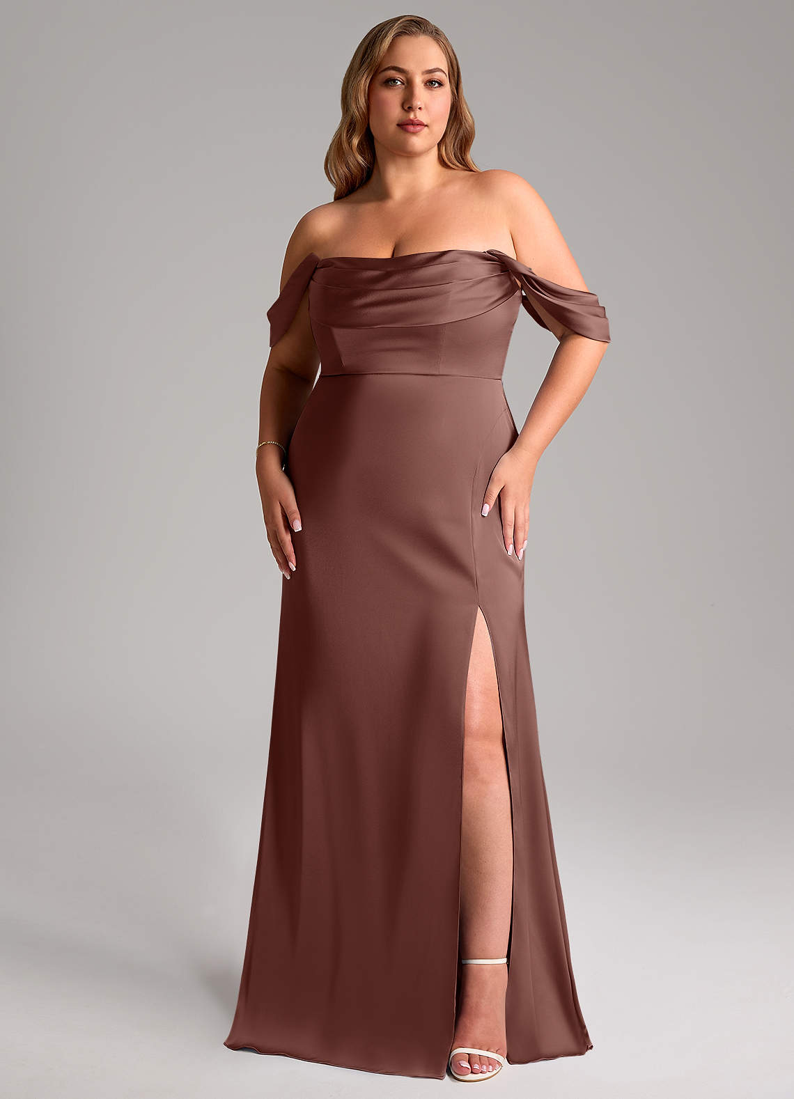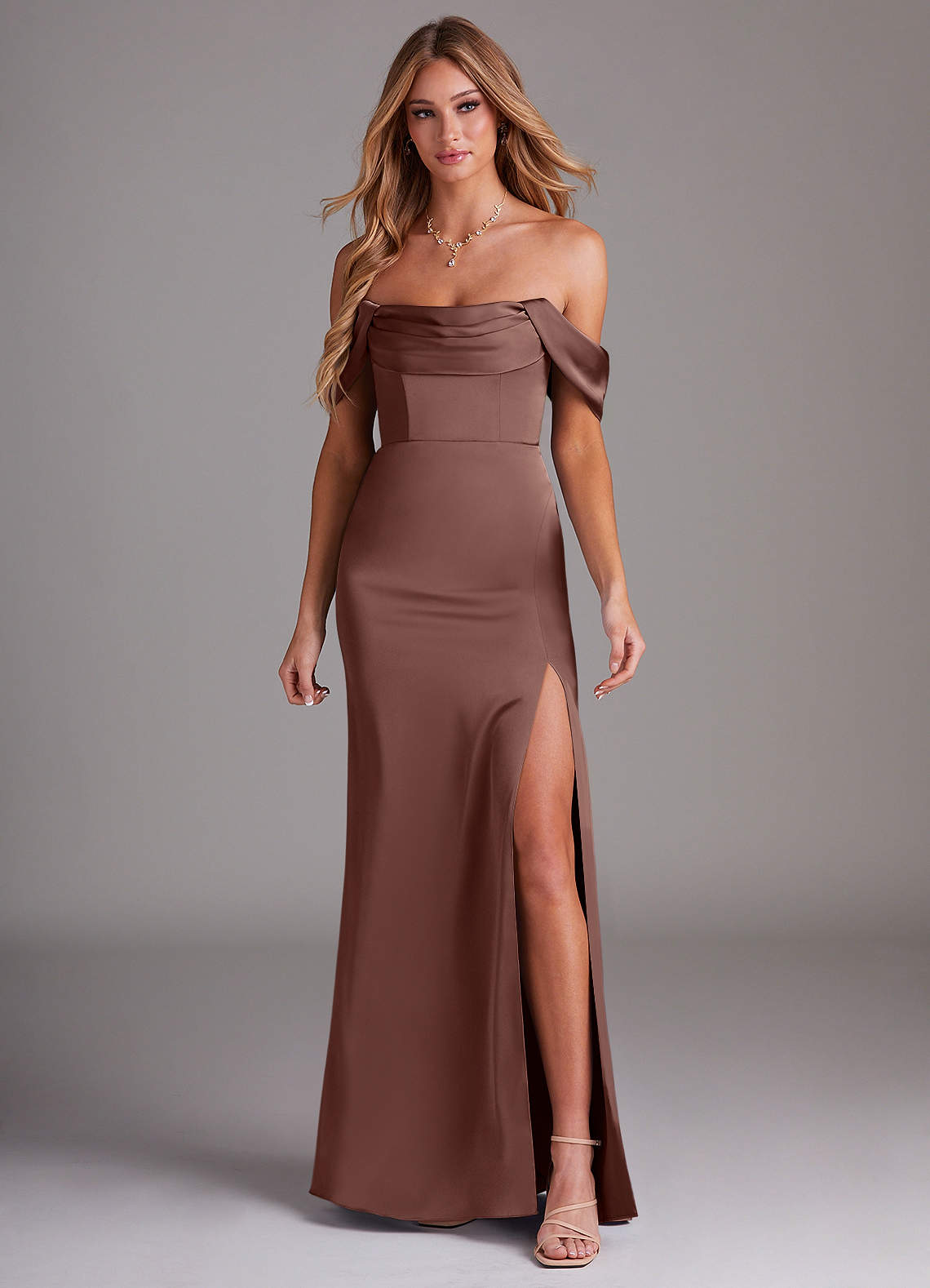 Seien Sie für Ihre beste Freundin da in Saige, unserem bodenlangen Stretch-Satinkleid. Es hat einen plissierten Wasserfallausschnitt, einen Meerjungfrauenrock, einen atemberaubenden Beinschlitz und abnehmbare plissierte schulterfreie Träger.