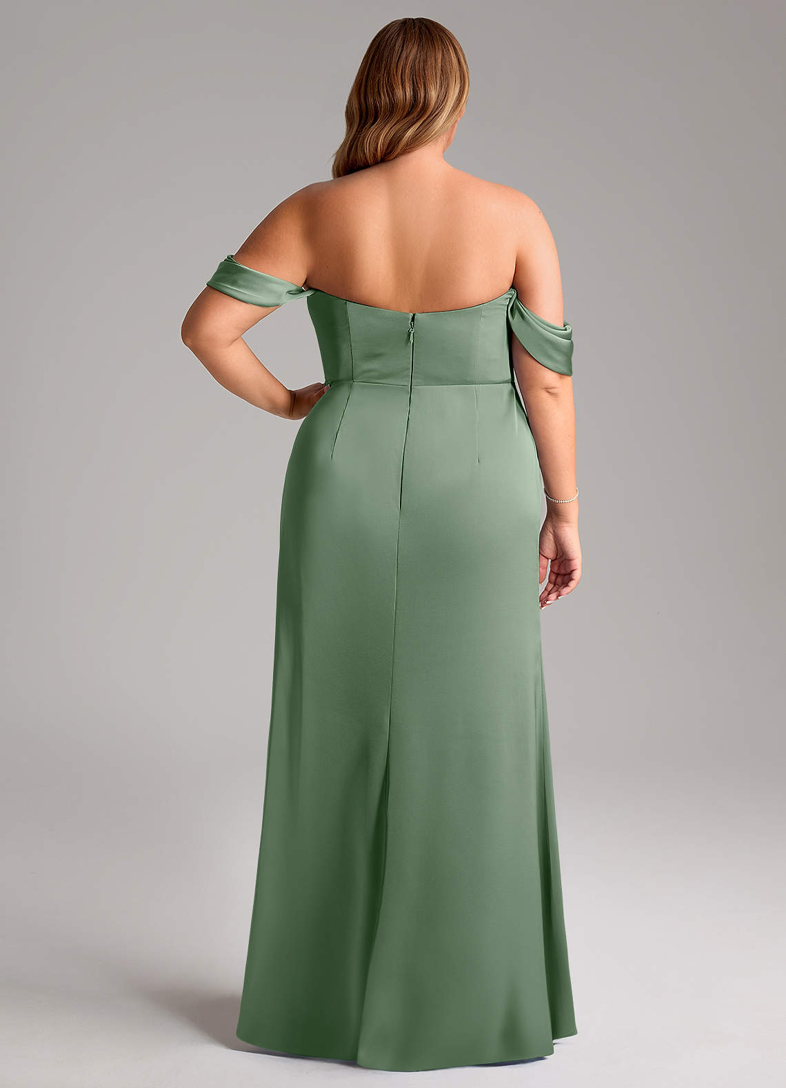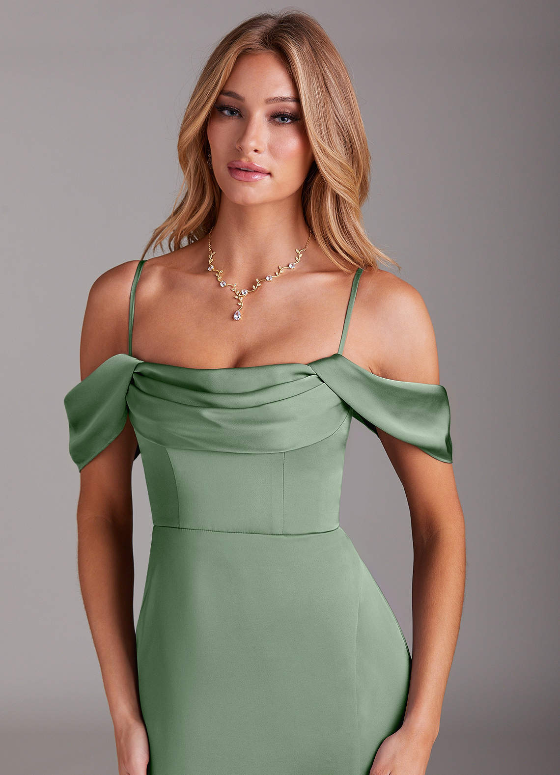 Seien Sie für Ihre beste Freundin da in Saige, unserem bodenlangen Stretch-Satinkleid. Es hat einen plissierten Wasserfallausschnitt, einen Meerjungfrauenrock, einen atemberaubenden Beinschlitz und abnehmbare plissierte schulterfreie Träger.