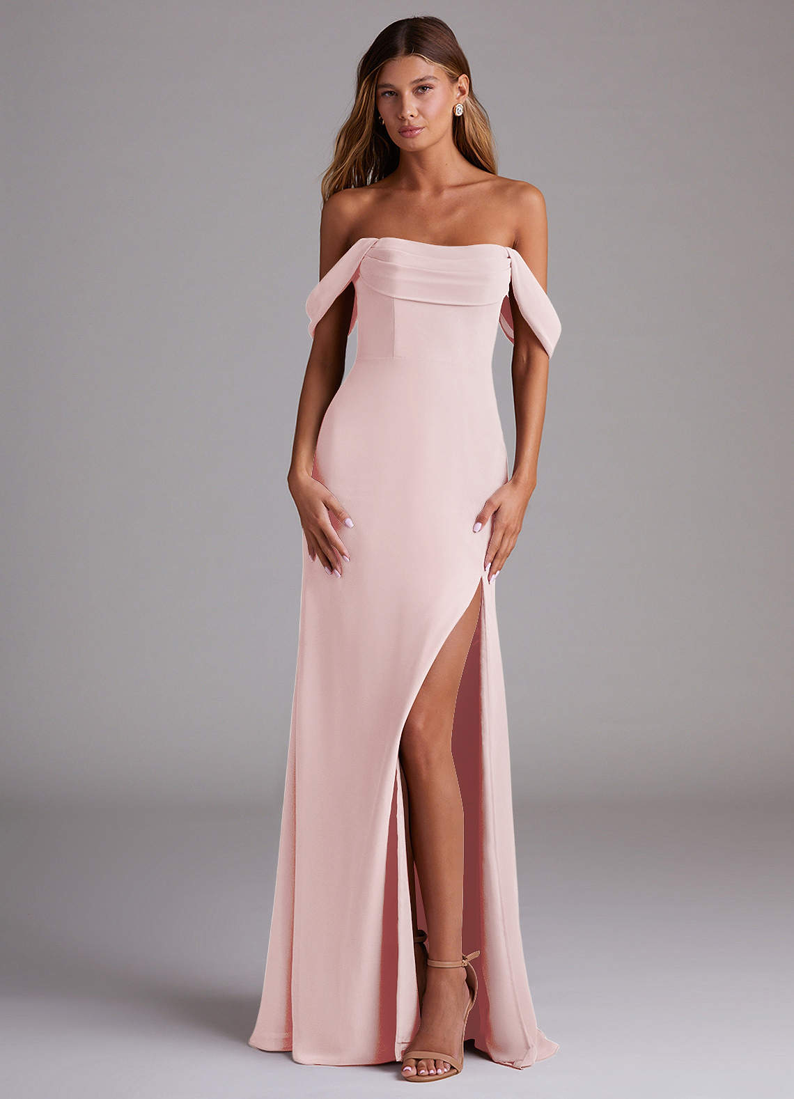 Seien Sie für Ihre beste Freundin da in Saige, unserem bodenlangen Chiffonkleid. Es hat einen plissierten Wasserfallausschnitt, einen Meerjungfrauenrock, einen atemberaubenden Beinschlitz und abnehmbare plissierte schulterfreie Träger.