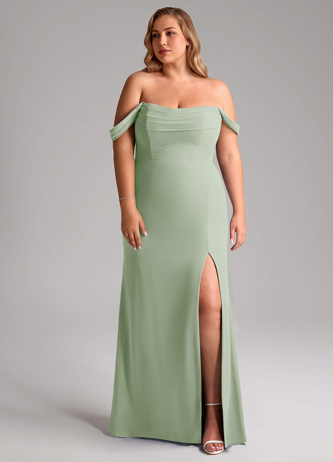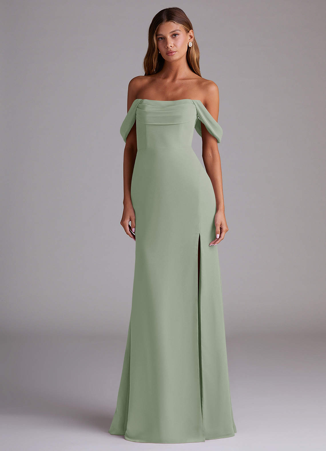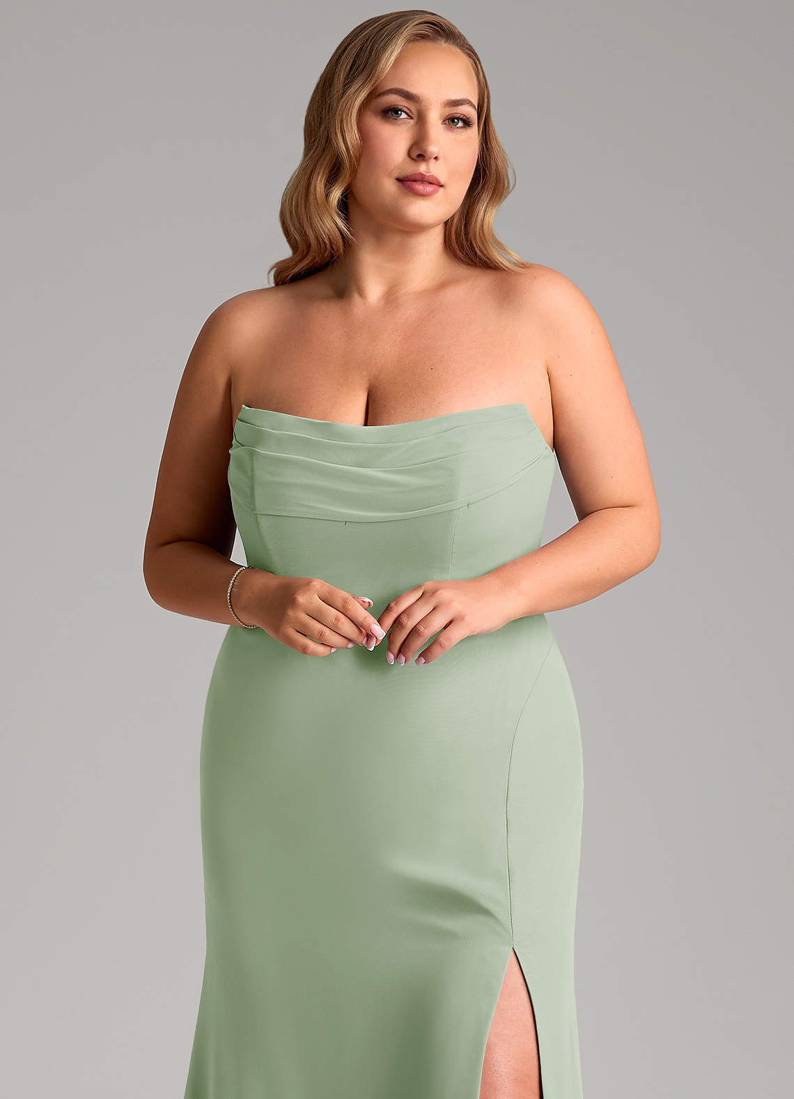 Seien Sie für Ihre beste Freundin da in Saige, unserem bodenlangen Chiffonkleid. Es hat einen plissierten Wasserfallausschnitt, einen Meerjungfrauenrock, einen atemberaubenden Beinschlitz und abnehmbare plissierte schulterfreie Träger.