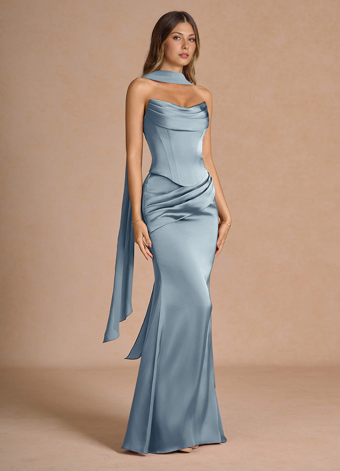 Elegantes zweiteiliges Satinkleid mit geschnürtem Korsett-Oberteil und bodenlangem Meerjungfrauenrock. Inklusive passendem Chiffonschal für zusätzliche Eleganz. Aus glänzendem Satin gefertigt, perfekt für Hochzeiten, formelle Anlässe oder Abendveranstaltungen.
