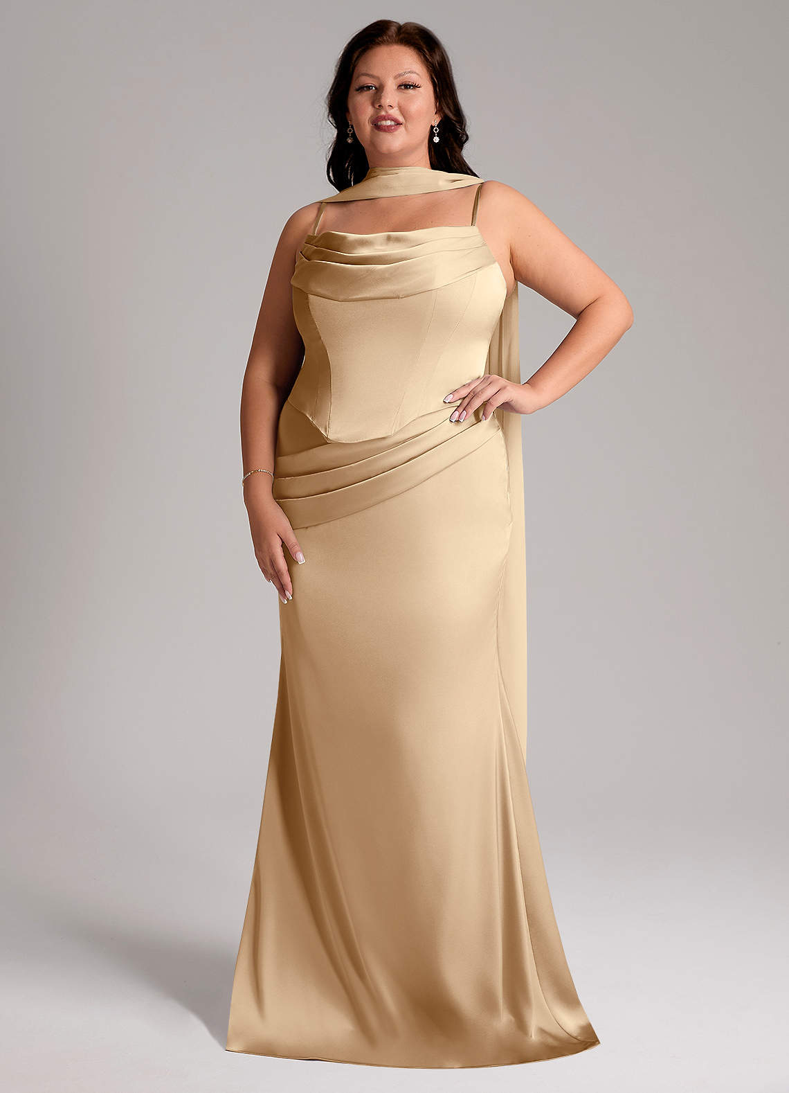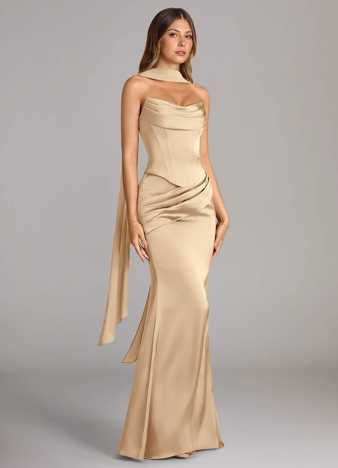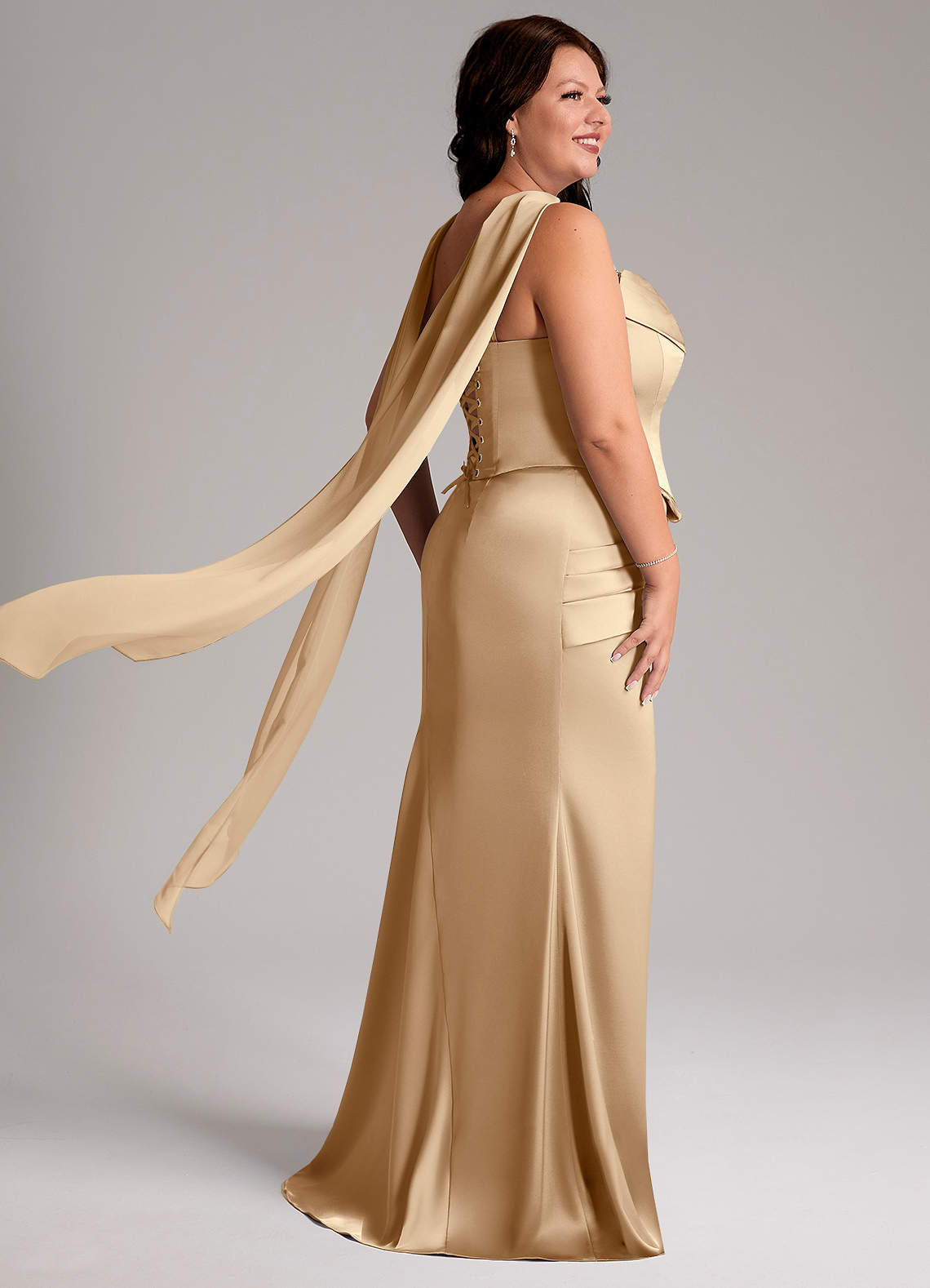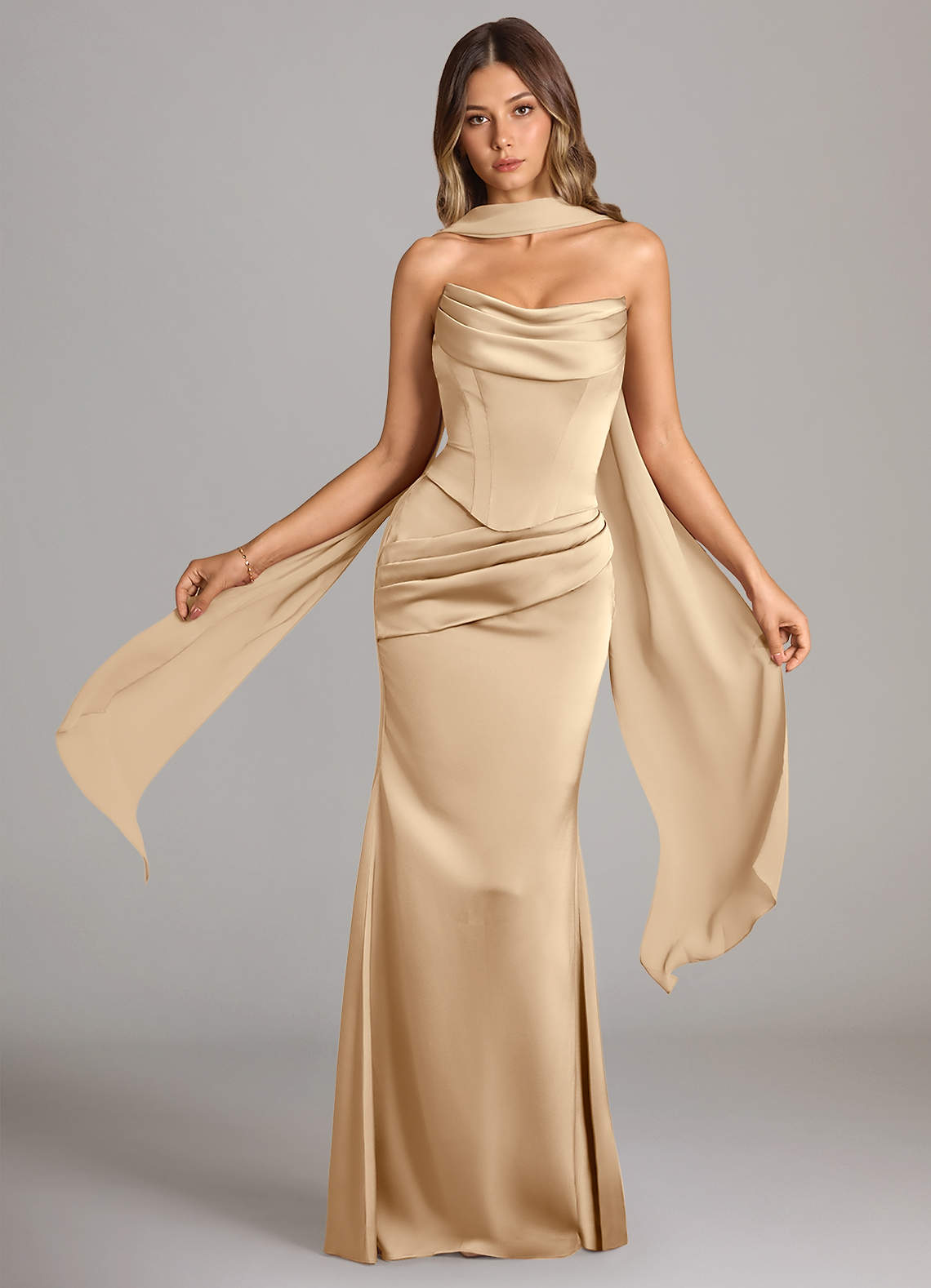 Elegantes zweiteiliges Satinkleid mit geschnürtem Korsett-Oberteil und bodenlangem Meerjungfrauenrock. Inklusive passendem Chiffonschal für zusätzliche Eleganz. Aus glänzendem Satin gefertigt, perfekt für Hochzeiten, formelle Anlässe oder Abendveranstaltungen.