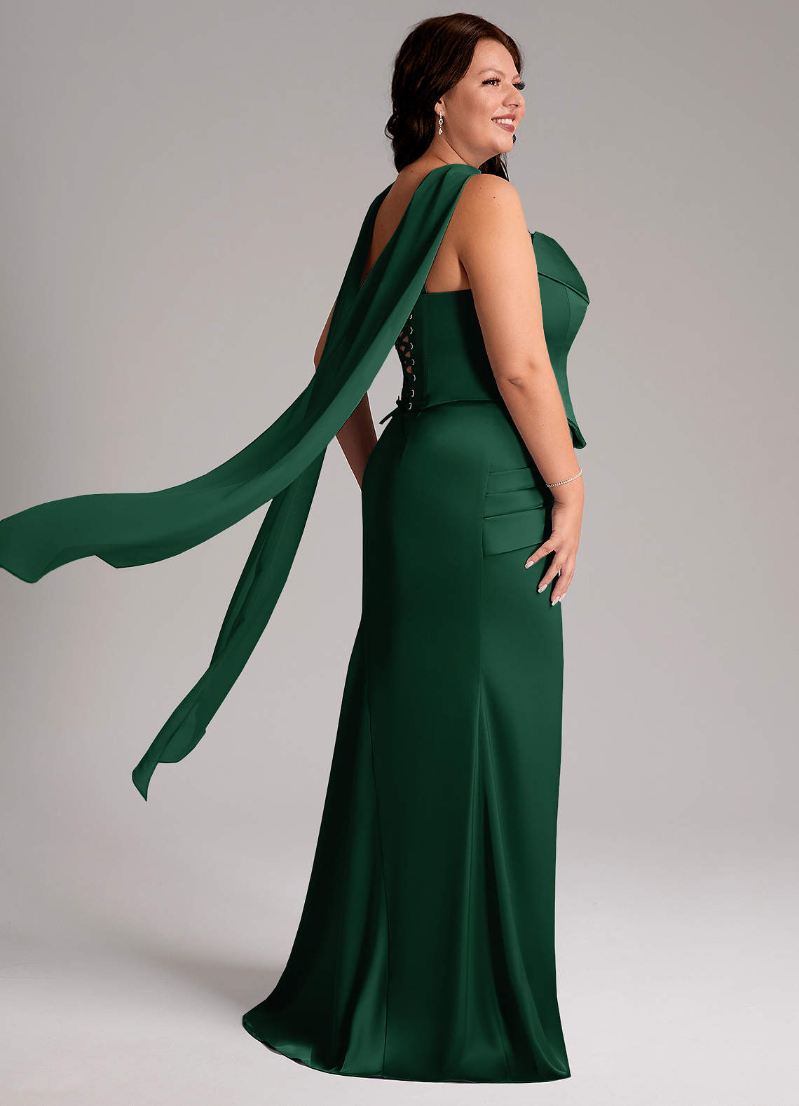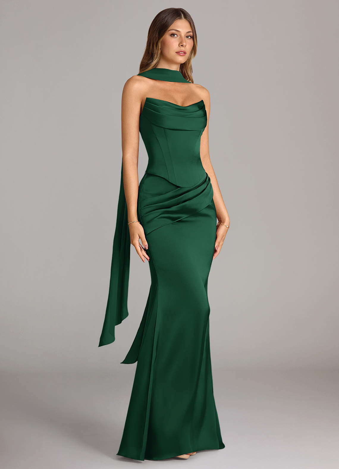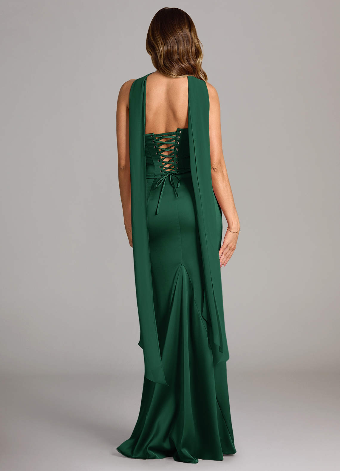 Elegantes zweiteiliges Satinkleid mit geschnürtem Korsett-Oberteil und bodenlangem Meerjungfrauenrock. Inklusive passendem Chiffonschal für zusätzliche Eleganz. Aus glänzendem Satin gefertigt, perfekt für Hochzeiten, formelle Anlässe oder Abendveranstaltungen.
