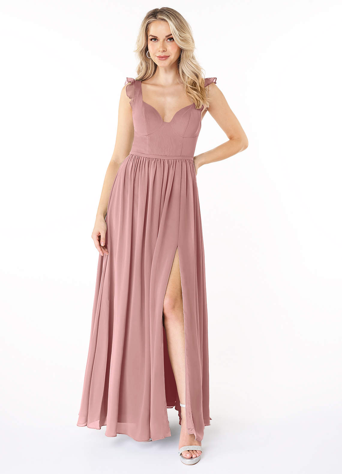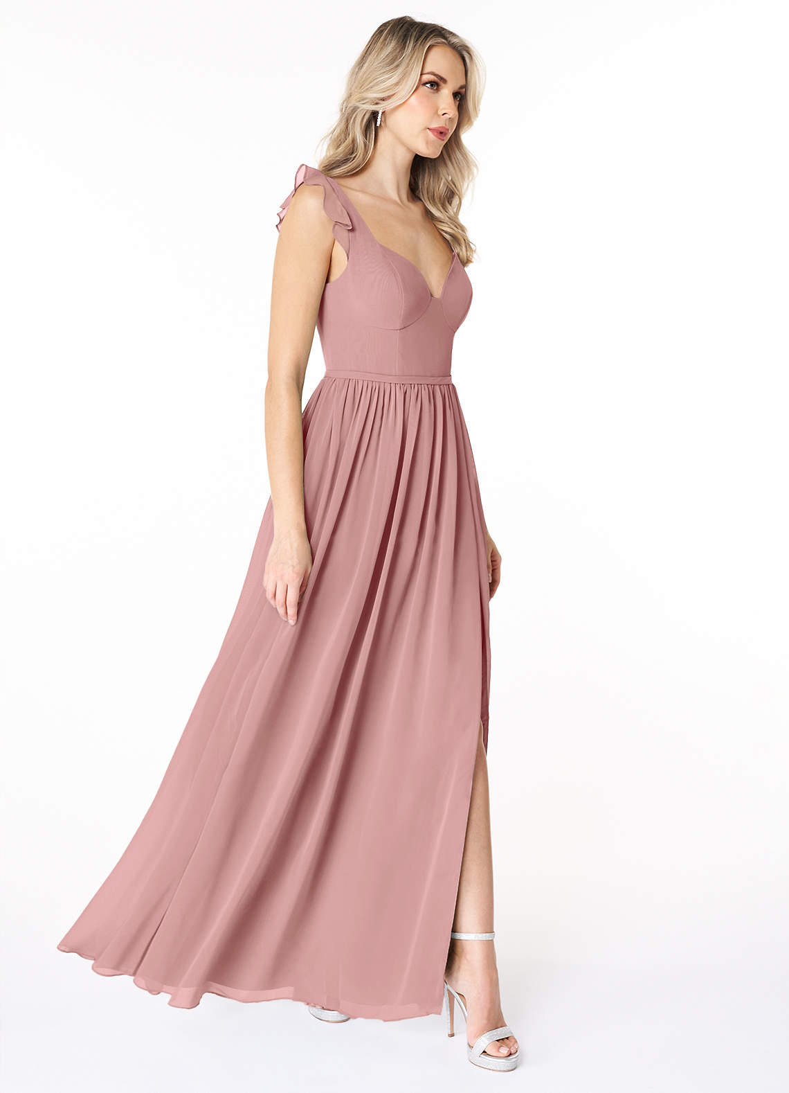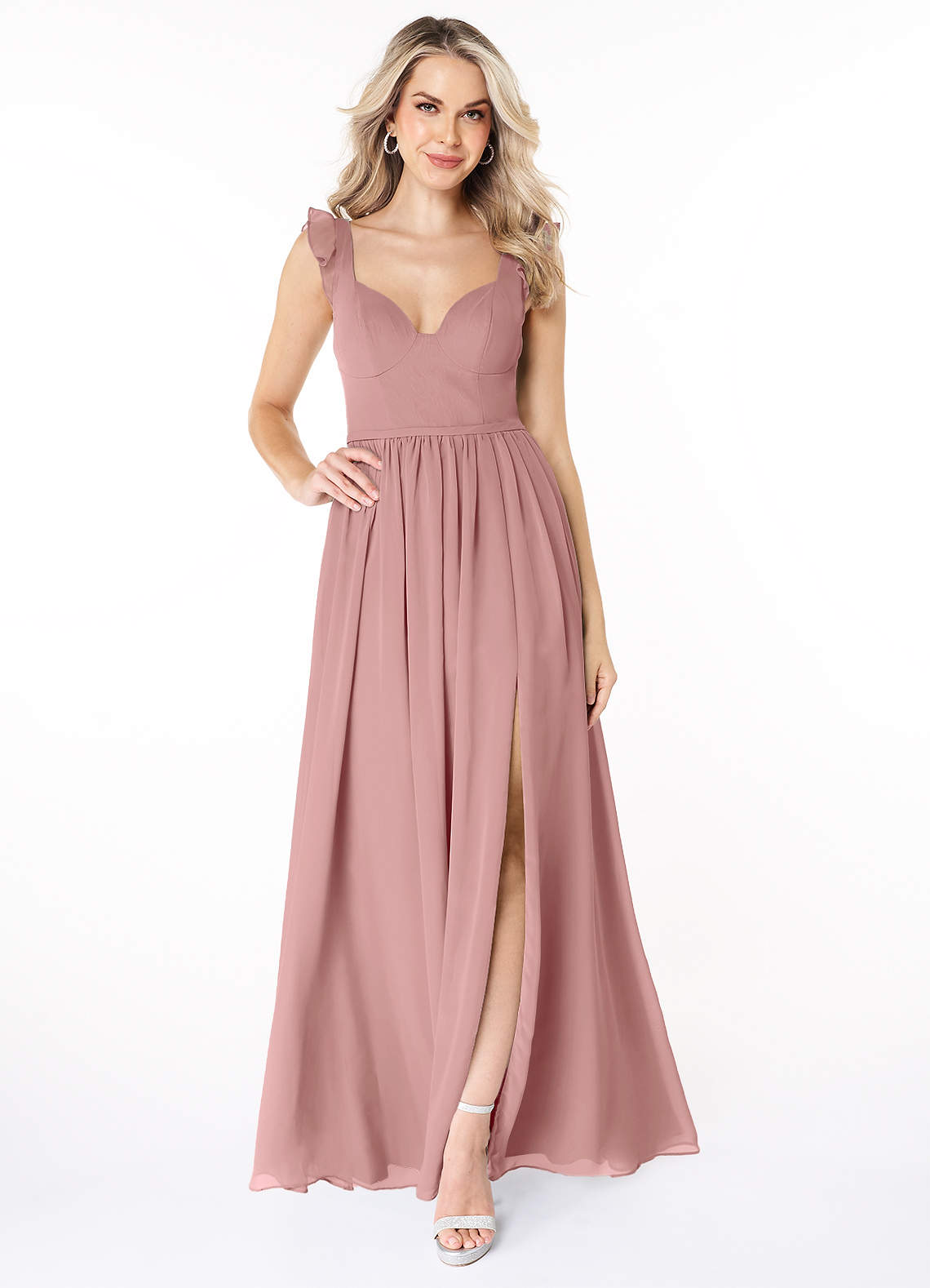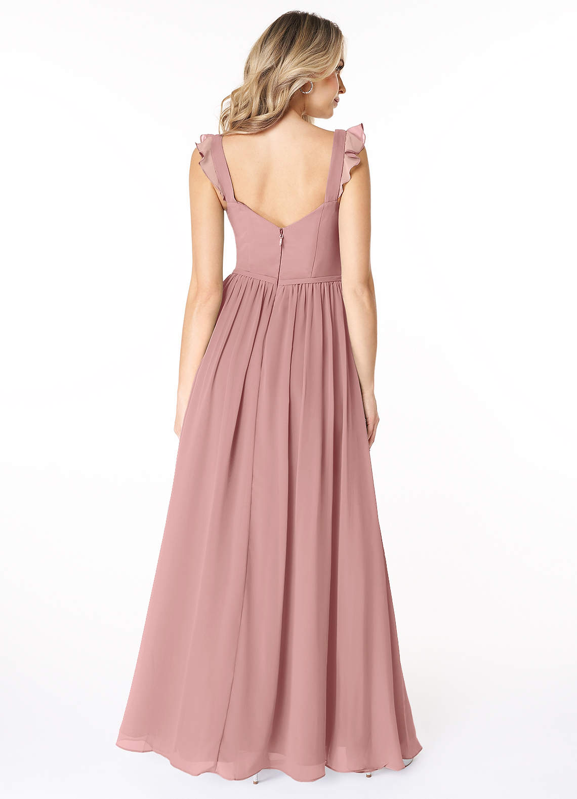 Stassie ist ein eleganter und koketter Stil für Ihre Brautjungfern. Aus Chiffon geschnitten, hat sie einen tiefen V-Ausschnitt mit wunderschönen Rüschenriemendetails. Sie hat einen klassischen V-Rücken und einen dünnen Taillengürtel, um die Figur zu betonen. Das Kleid ist komplett mit einem gerafften Rock in A-Linie und einem Beinschlitz.