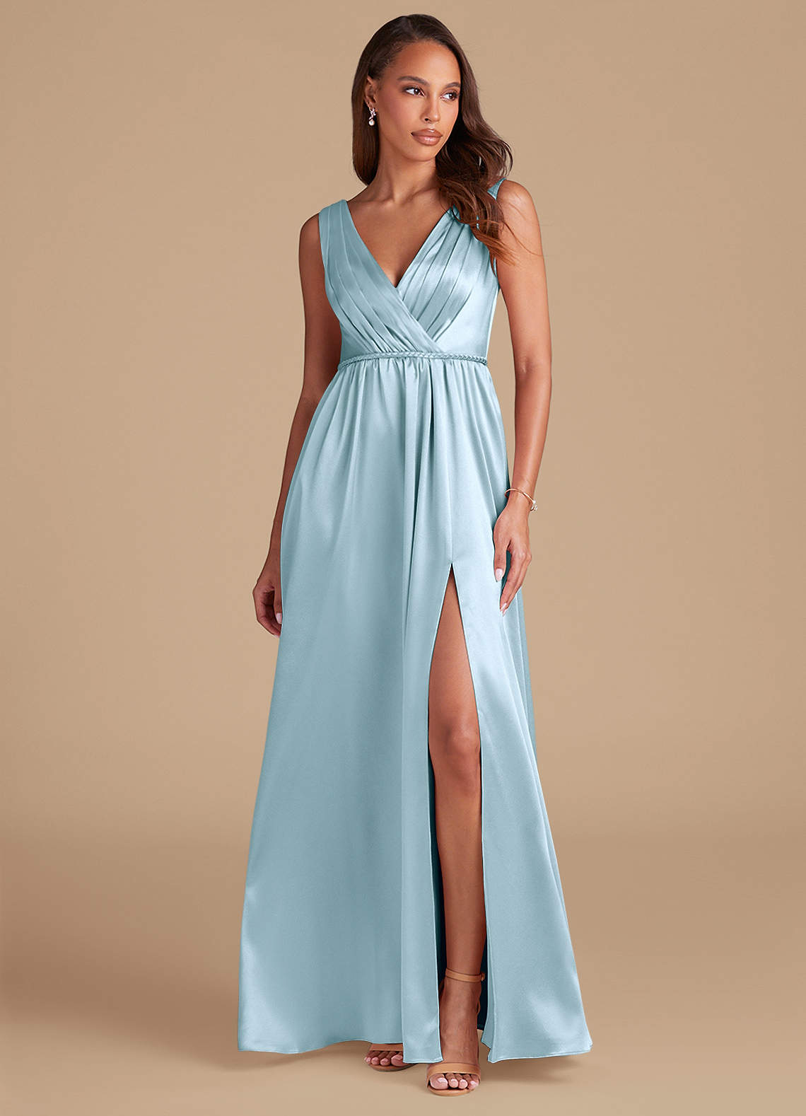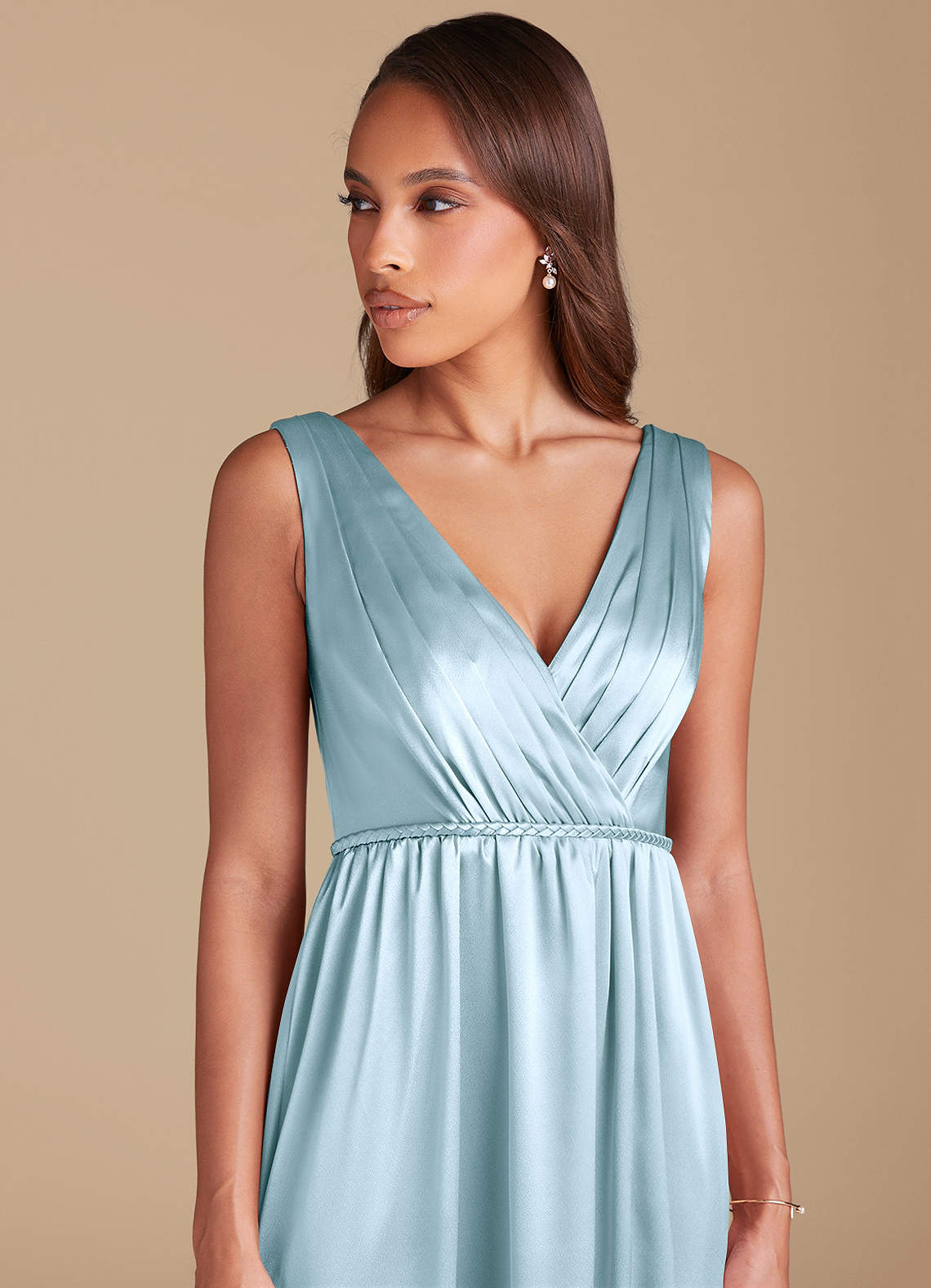 Tanicia ist ein wunderschönes Brautjungfernkleid mit A-Linienrock und V-Ausschnitt. Die Taille wird durch einen geflochtenen Gürtel betont, der für zusätzlichen Charme sorgt. Dieses Brautjungfernkleid aus metallischem Satin hat einen Seitenschlitz, der etwas Bein zeigt, und einen V-förmigen Rücken. Das Oberteil und der Rücken sind strategisch plissiert, was ihm einen eleganteren Look verleiht.