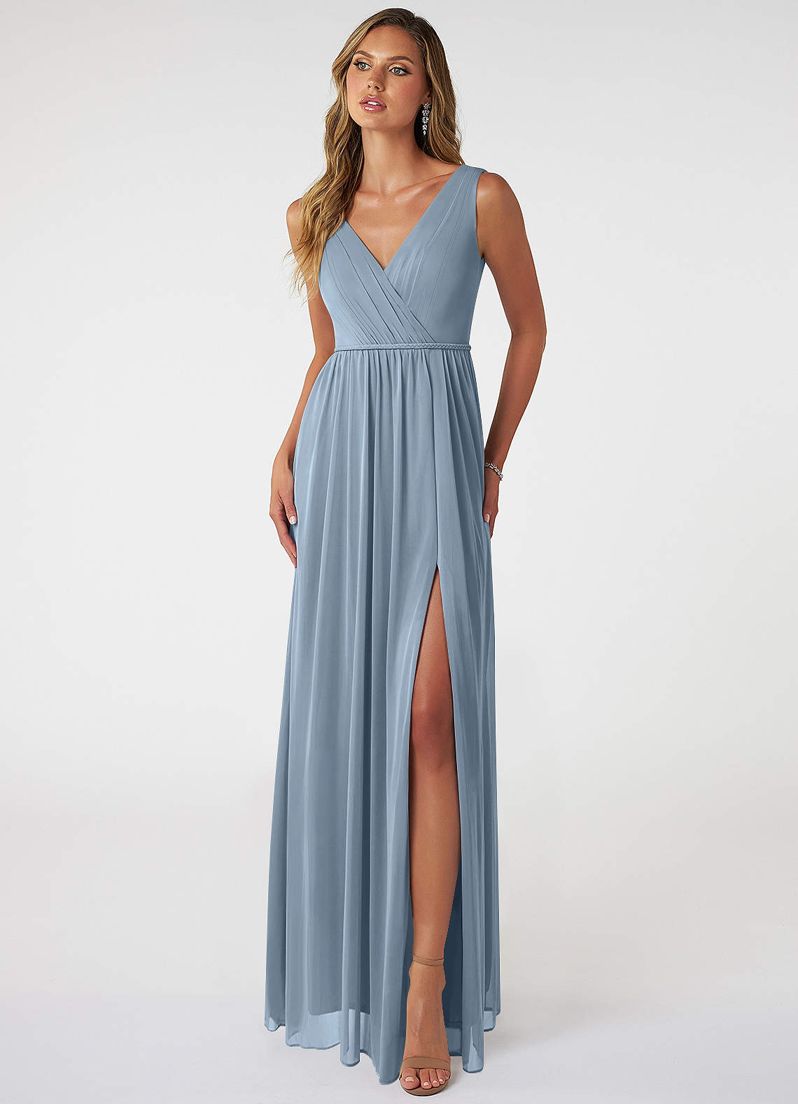 Tanicia ist ein wunderschönes Brautjungfernkleid mit Rock in A-Linie und V-Ausschnitt. Die Taille wird mit einem geflochtenen Gürtel für zusätzlichen Charme betont. Dieses Kleid hat einen Seitenschlitz, um etwas Bein zu zeigen, und einen V-förmigen Rücken. Das Oberteil und der Rücken sind strategisch plissiert, was ihm einen eleganteren Look verleiht.