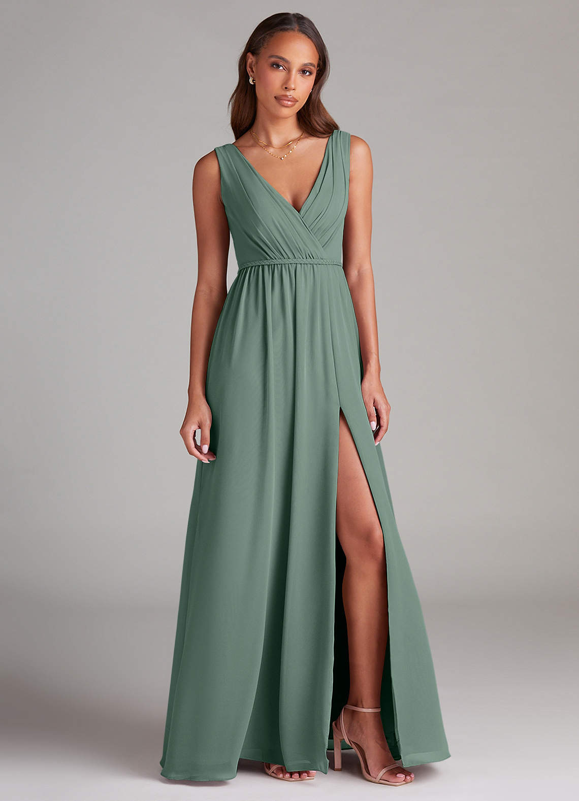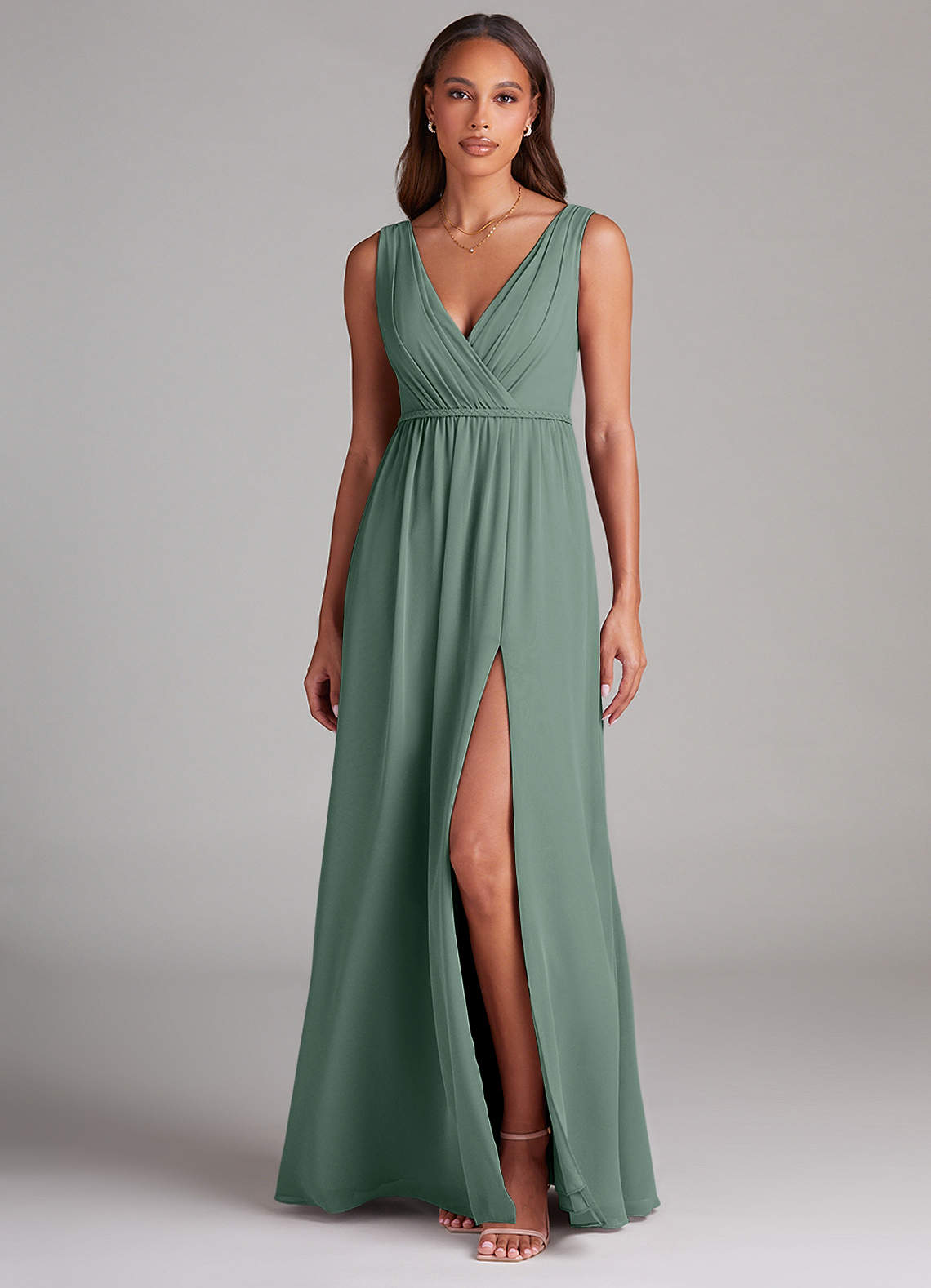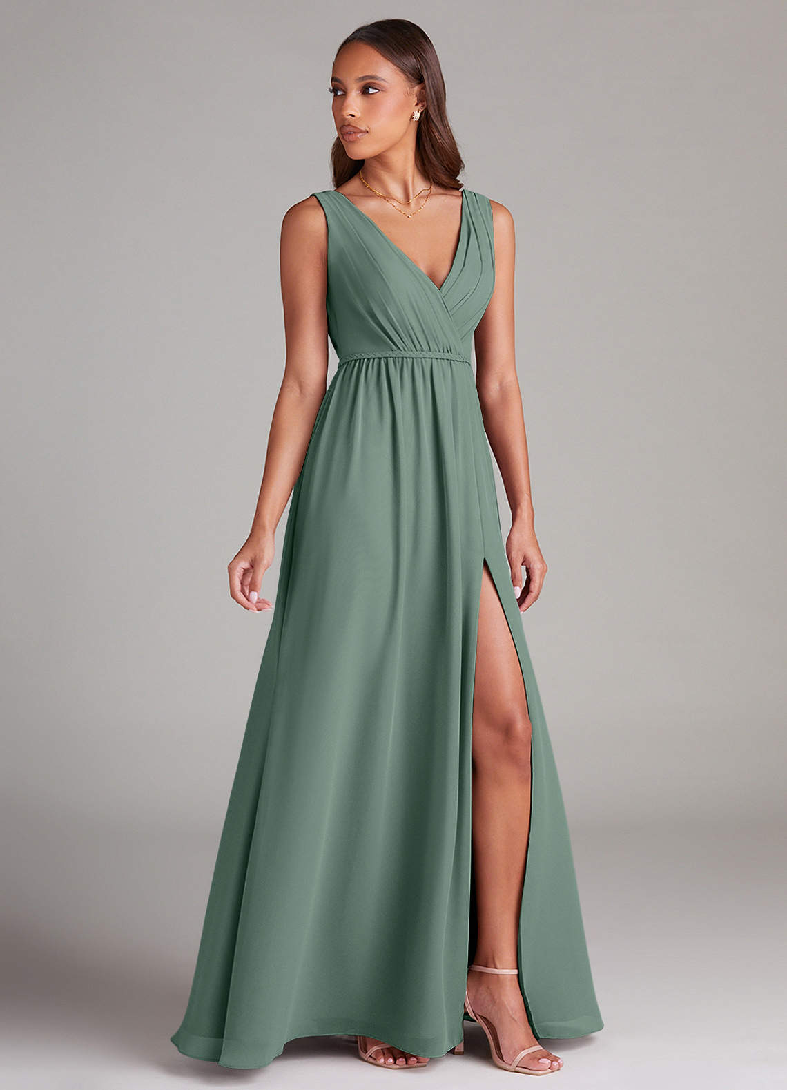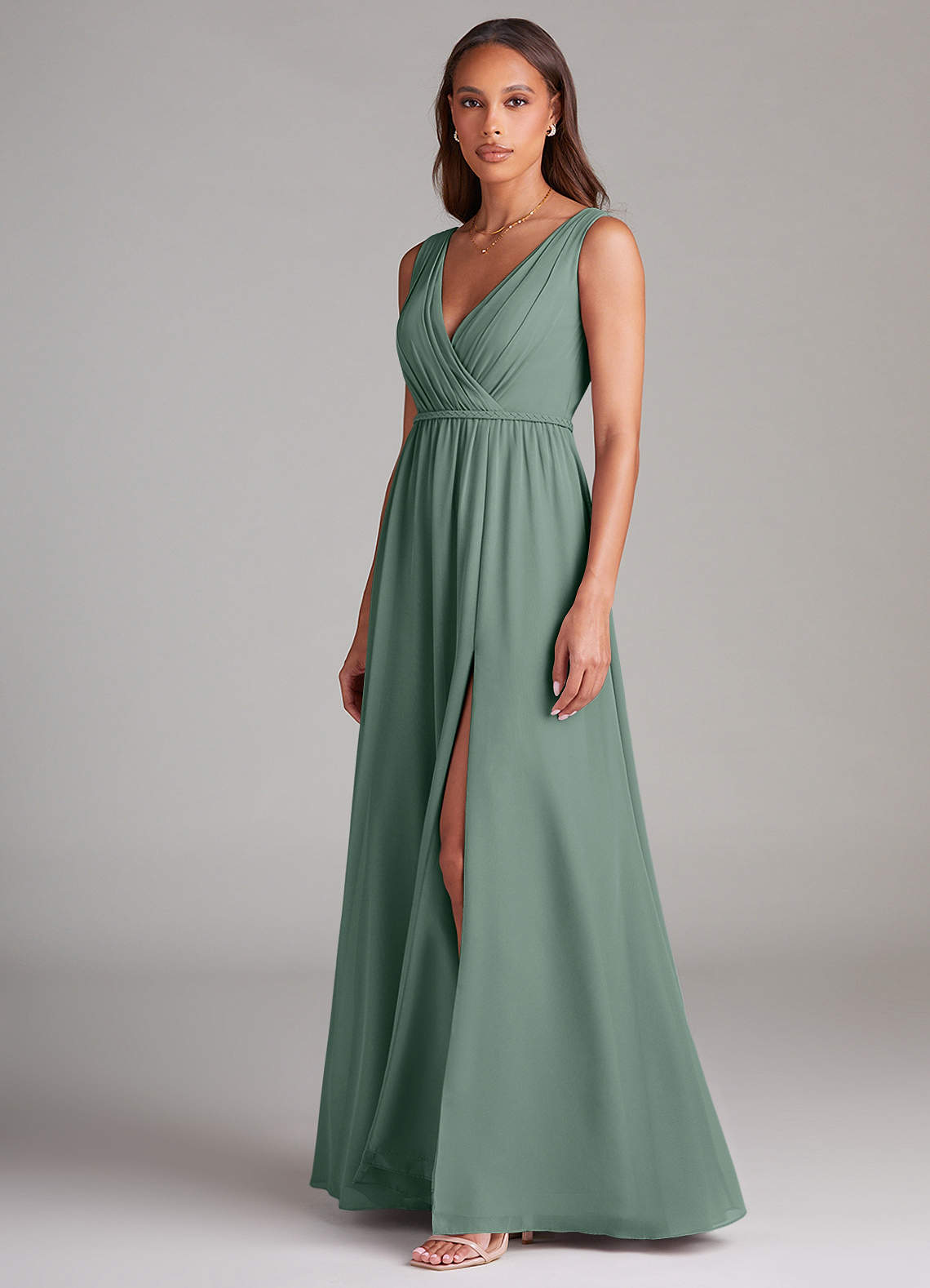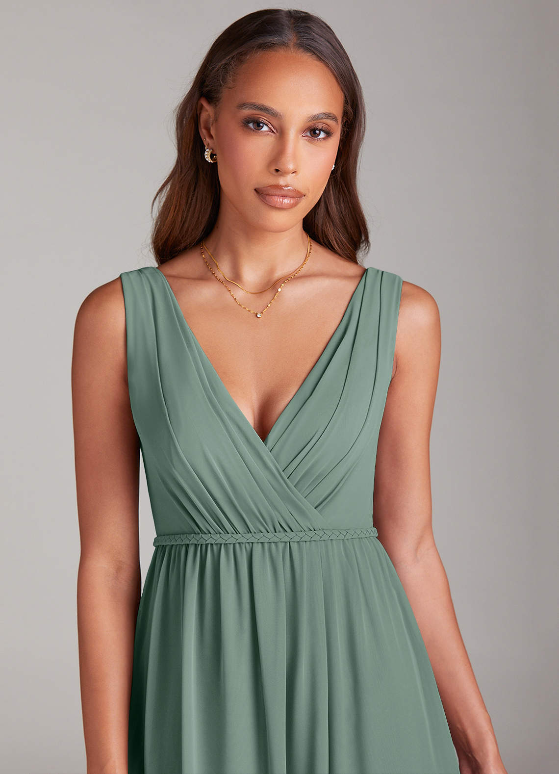Tanicia ist ein wunderschönes Brautjungfernkleid mit A-Linien-Rock und V-Ausschnitt. Die Taille wird durch einen geflochtenen Gürtel betont, der für zusätzlichen Charme sorgt. Dieses Chiffon-Brautjungfernkleid hat einen Seitenschlitz, der etwas Bein zeigt, und einen V-förmigen Rücken. Das Oberteil und der Rücken sind strategisch plissiert, was ihm einen eleganteren Look verleiht.