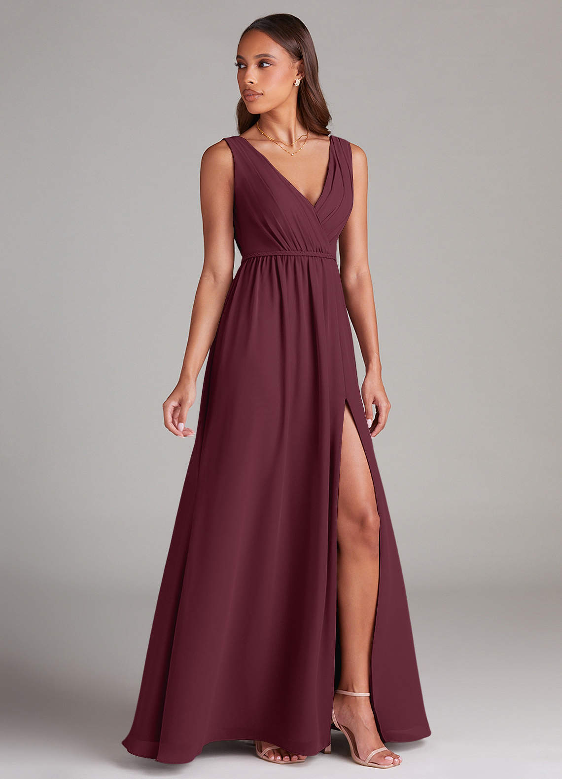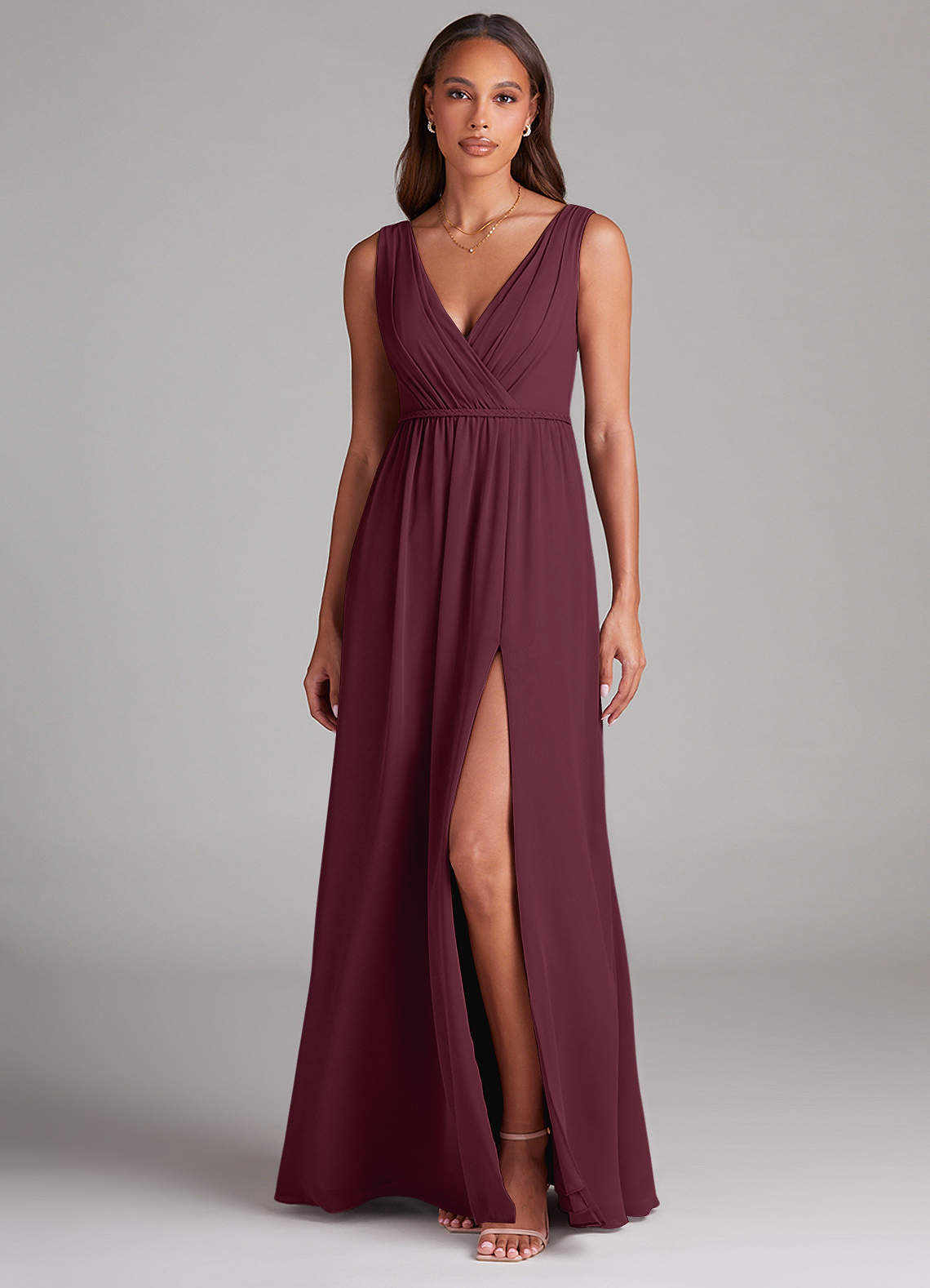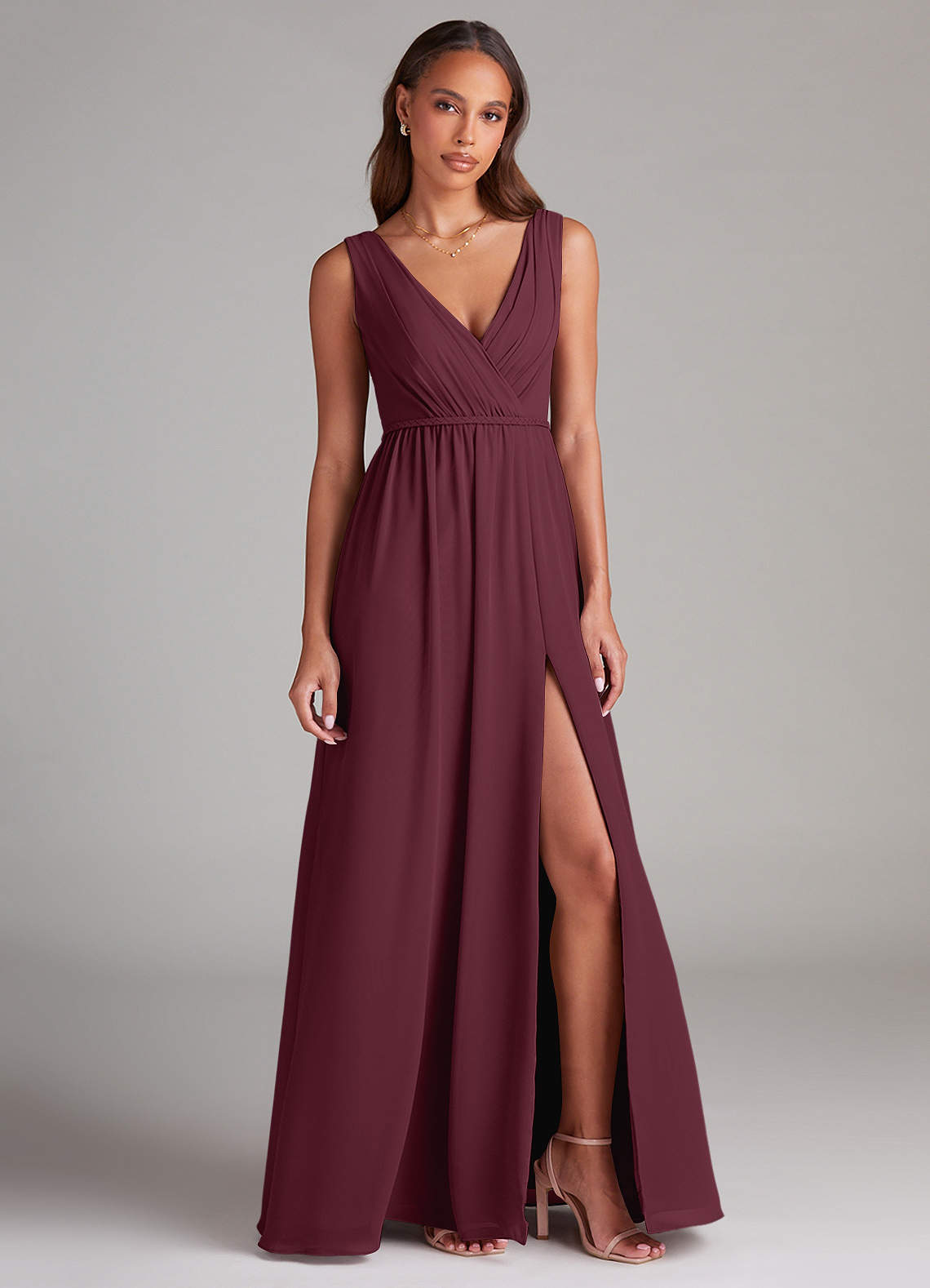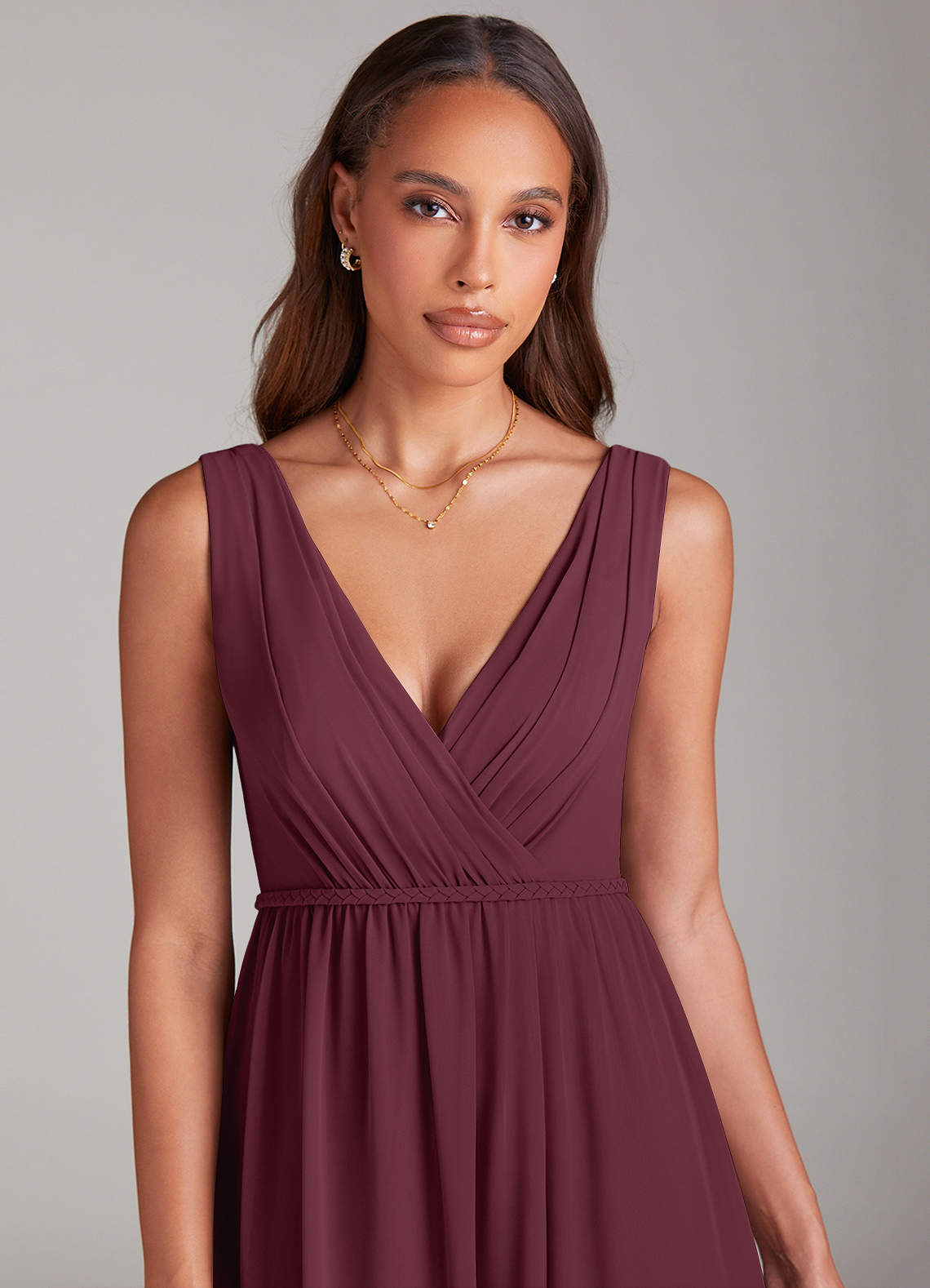 Tanicia ist ein wunderschönes Brautjungfernkleid mit A-Linien-Rock und V-Ausschnitt. Die Taille wird durch einen geflochtenen Gürtel betont, der für zusätzlichen Charme sorgt. Dieses Chiffon-Brautjungfernkleid hat einen Seitenschlitz, der etwas Bein zeigt, und einen V-förmigen Rücken. Das Oberteil und der Rücken sind strategisch plissiert, was ihm einen eleganteren Look verleiht.
