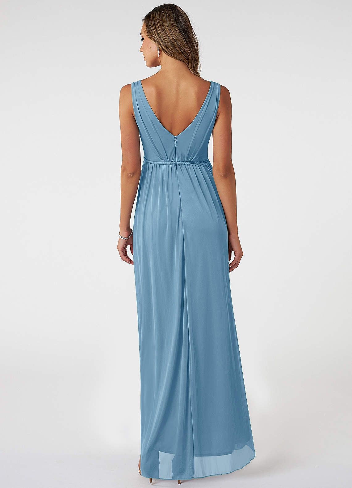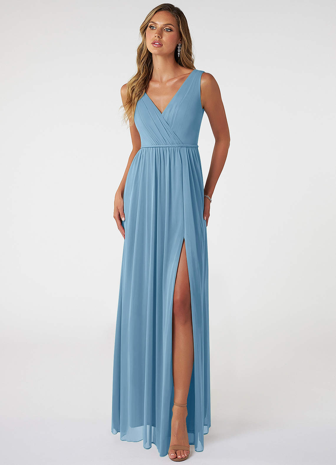 Tanicia ist ein wunderschönes Brautjungfernkleid mit Rock in A-Linie und V-Ausschnitt. Die Taille wird mit einem geflochtenen Gürtel für zusätzlichen Charme betont. Dieses Kleid hat einen Seitenschlitz, um etwas Bein zu zeigen, und einen V-förmigen Rücken. Das Oberteil und der Rücken sind strategisch plissiert, was ihm einen eleganteren Look verleiht.