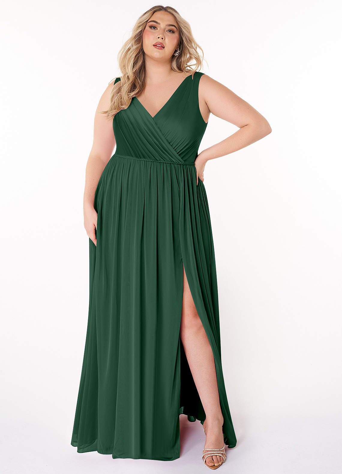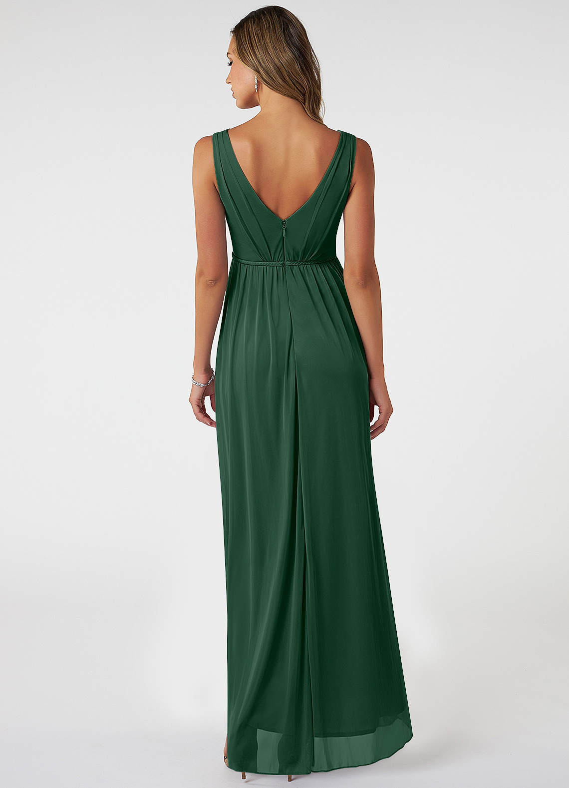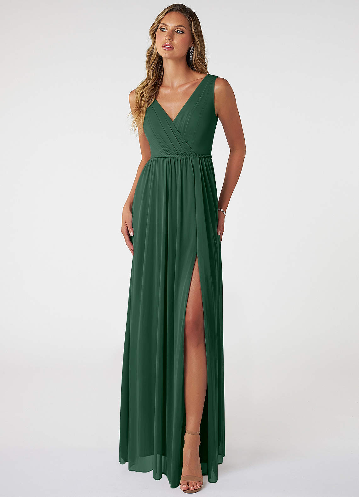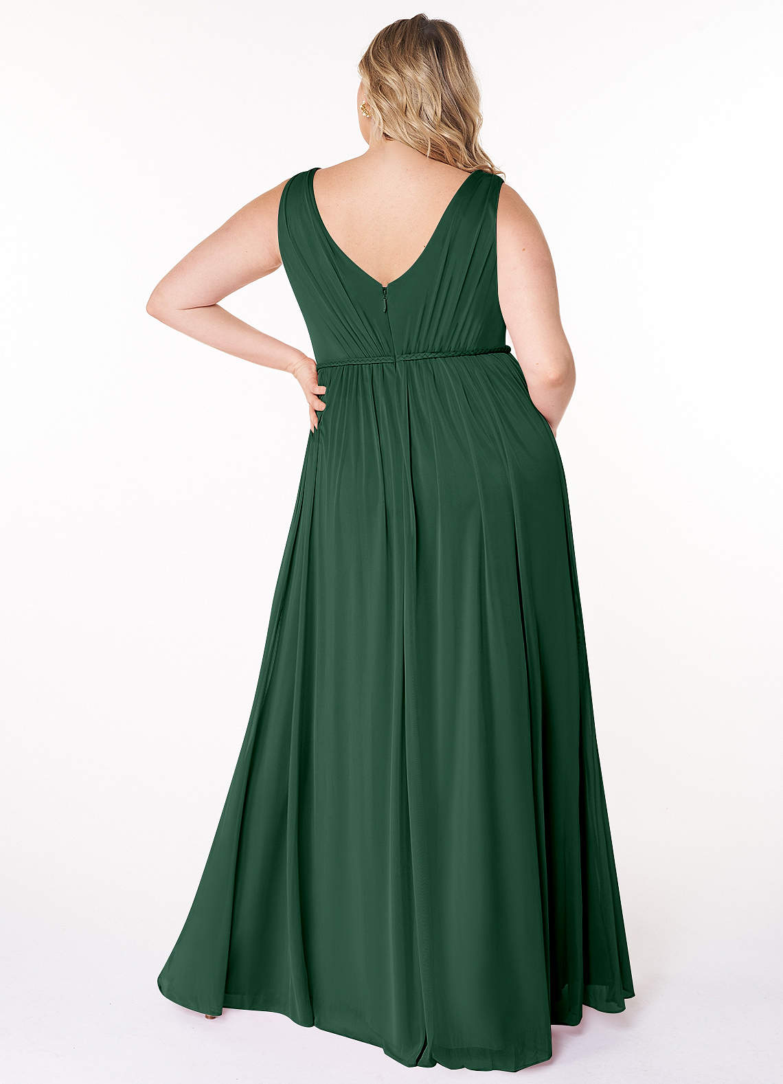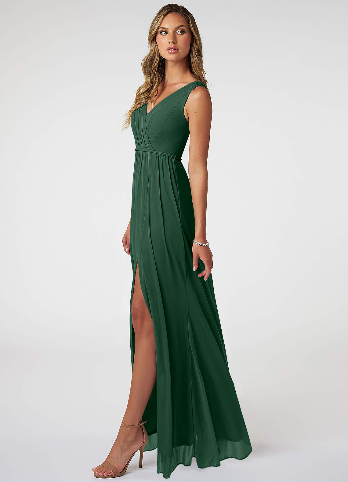 Tanicia ist ein wunderschönes Brautjungfernkleid mit Rock in A-Linie und V-Ausschnitt. Die Taille wird mit einem geflochtenen Gürtel für zusätzlichen Charme betont. Dieses Kleid hat einen Seitenschlitz, um etwas Bein zu zeigen, und einen V-förmigen Rücken. Das Oberteil und der Rücken sind strategisch plissiert, was ihm einen eleganteren Look verleiht.