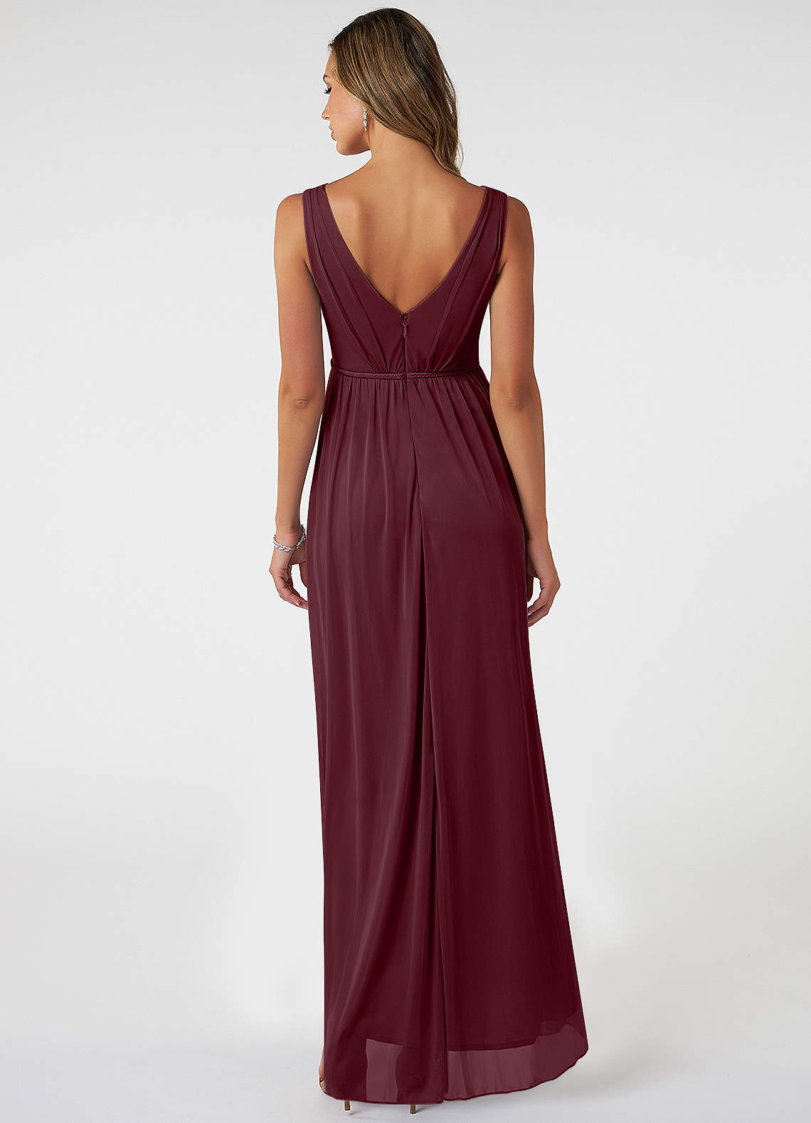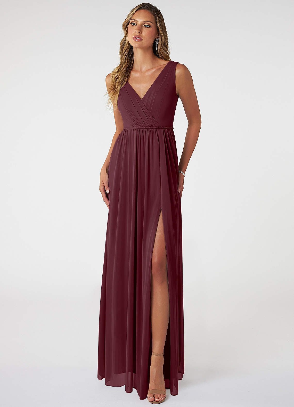 Tanicia ist ein wunderschönes Brautjungfernkleid mit Rock in A-Linie und V-Ausschnitt. Die Taille wird mit einem geflochtenen Gürtel für zusätzlichen Charme betont. Dieses Kleid hat einen Seitenschlitz, um etwas Bein zu zeigen, und einen V-förmigen Rücken. Das Oberteil und der Rücken sind strategisch plissiert, was ihm einen eleganteren Look verleiht.
