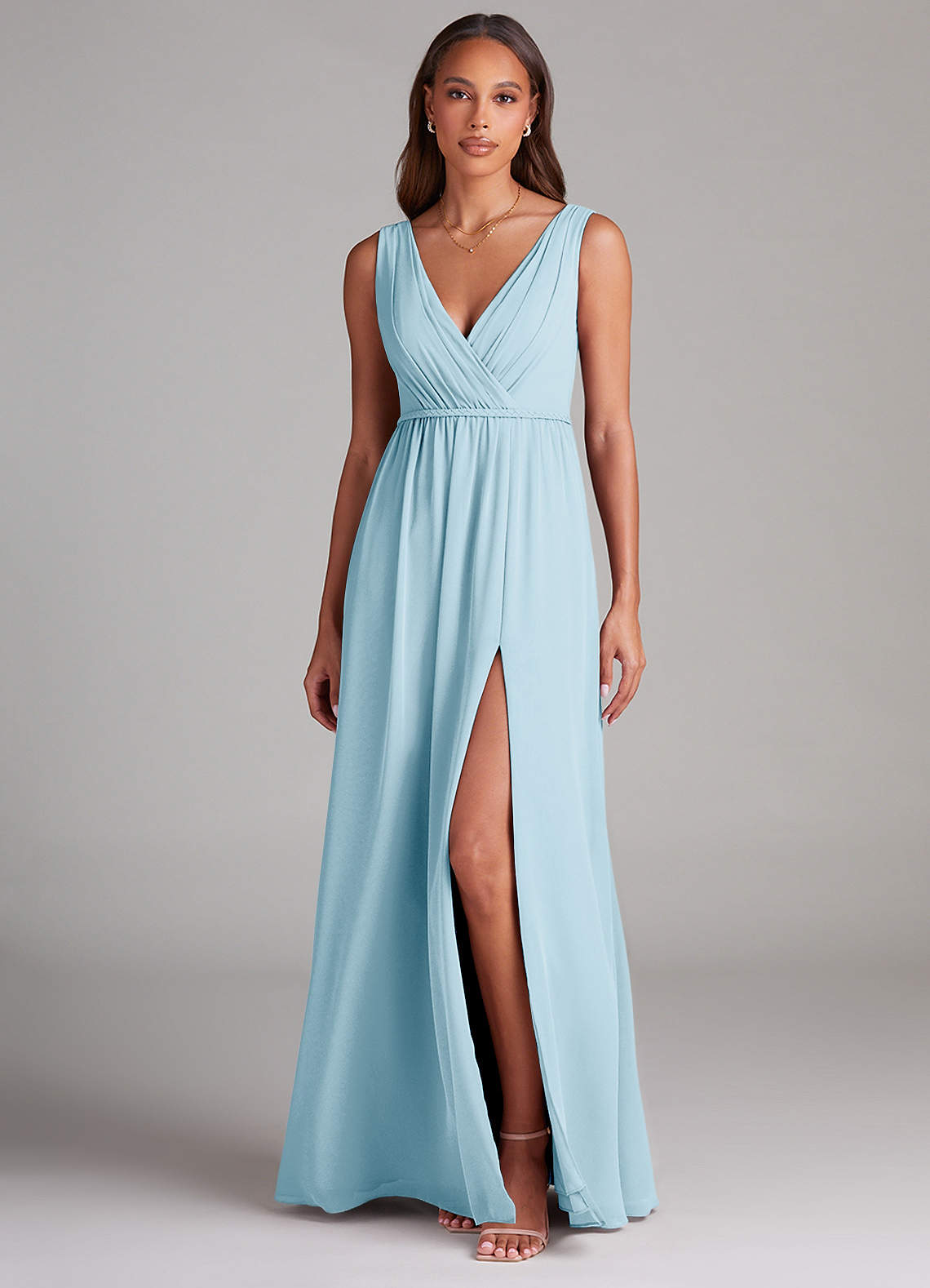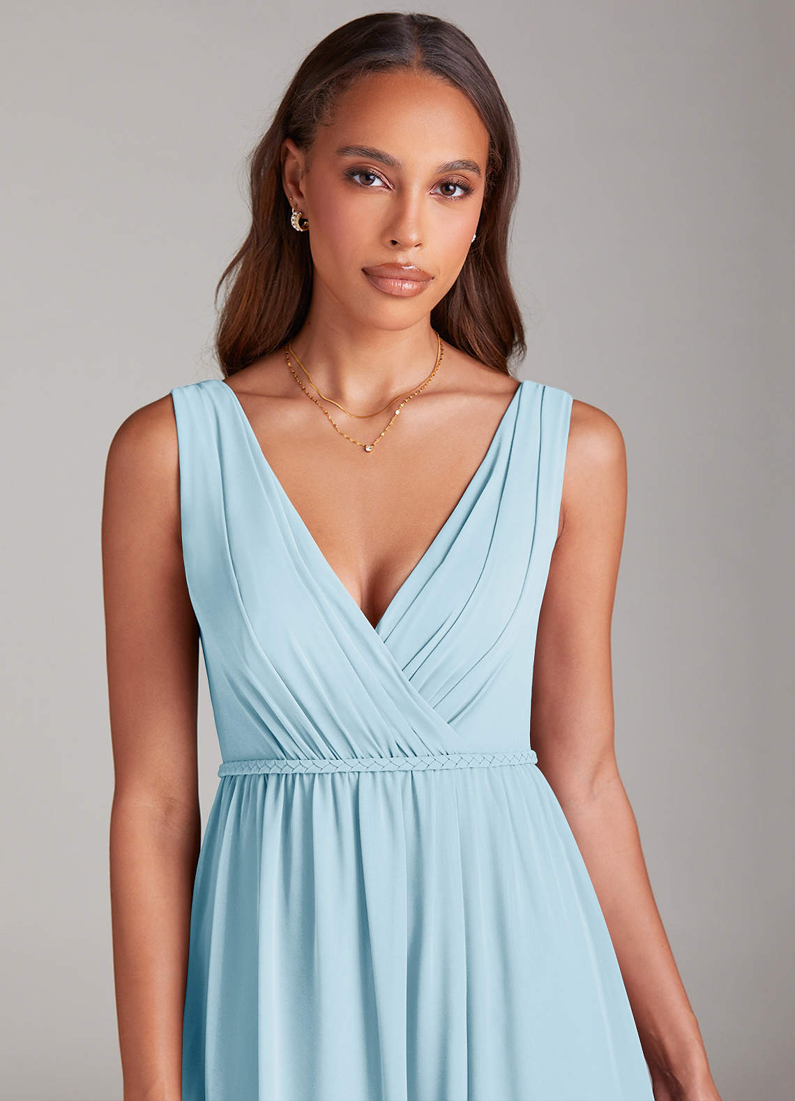 Tanicia ist ein wunderschönes Brautjungfernkleid mit A-Linien-Rock und V-Ausschnitt. Die Taille wird durch einen geflochtenen Gürtel betont, der für zusätzlichen Charme sorgt. Dieses Chiffon-Brautjungfernkleid hat einen Seitenschlitz, der etwas Bein zeigt, und einen V-förmigen Rücken. Das Oberteil und der Rücken sind strategisch plissiert, was ihm einen eleganteren Look verleiht.