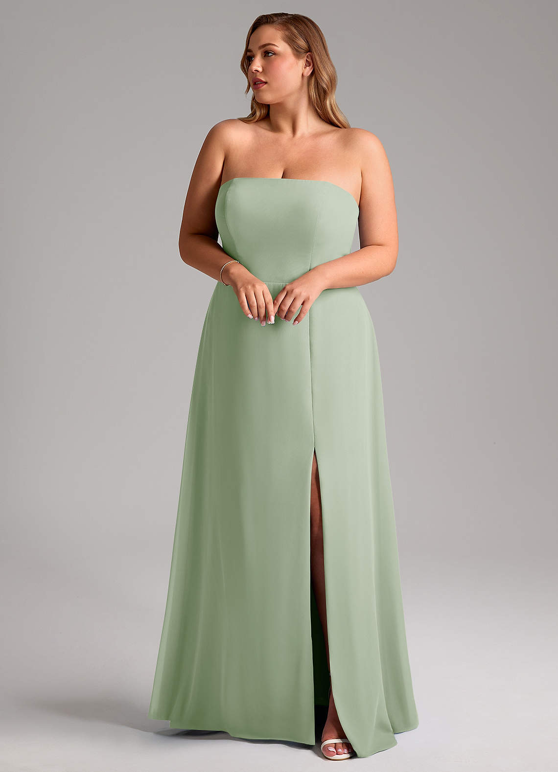 Wren ist unser klassisches Chiffon-Brautjungfernkleid. Es hat einen schmeichelhaften trägerlosen Ausschnitt und einen Beinschlitz, der Ihre Beine zur Geltung bringt.