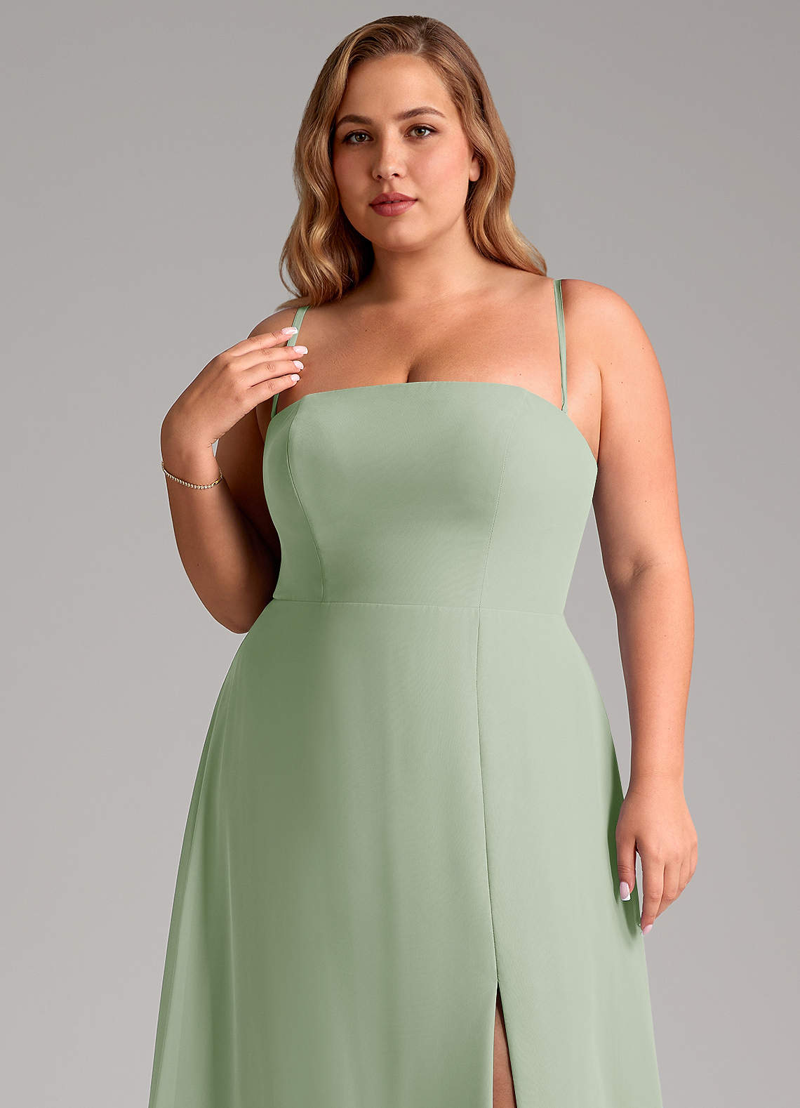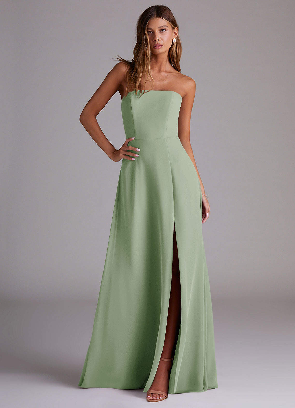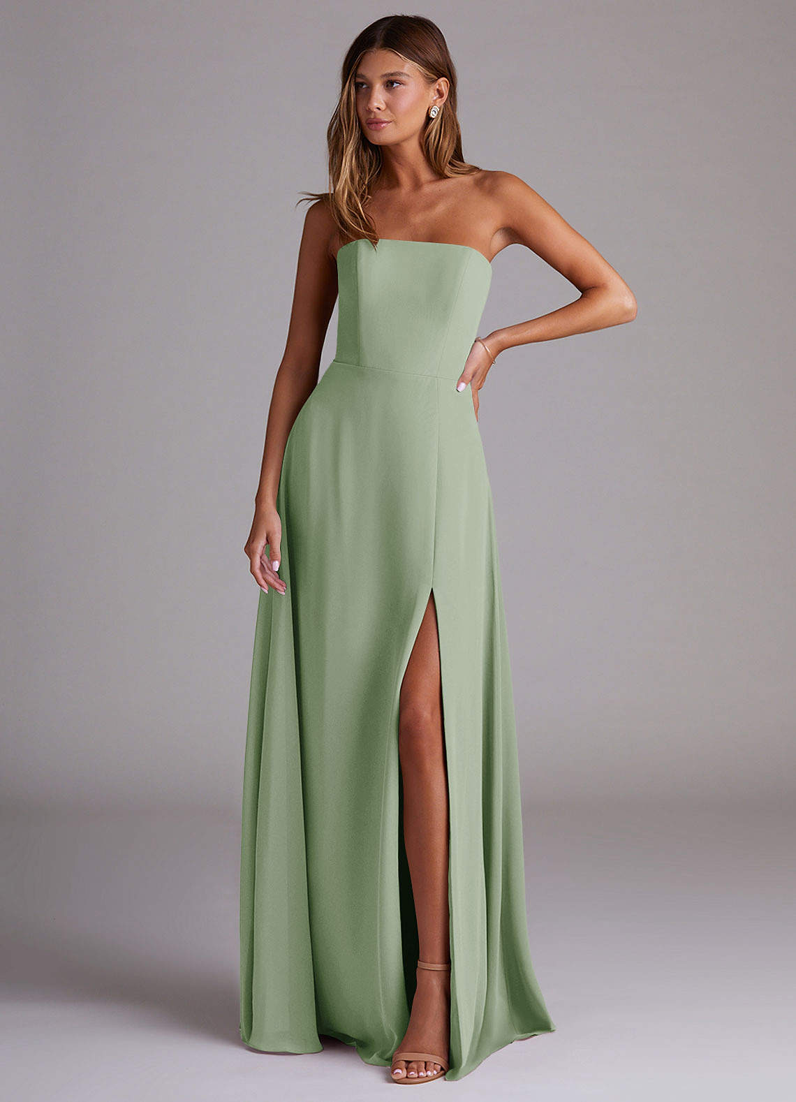 Wren ist unser klassisches Chiffon-Brautjungfernkleid. Es hat einen schmeichelhaften trägerlosen Ausschnitt und einen Beinschlitz, der Ihre Beine zur Geltung bringt.