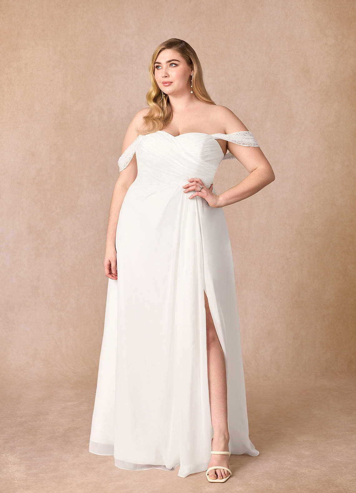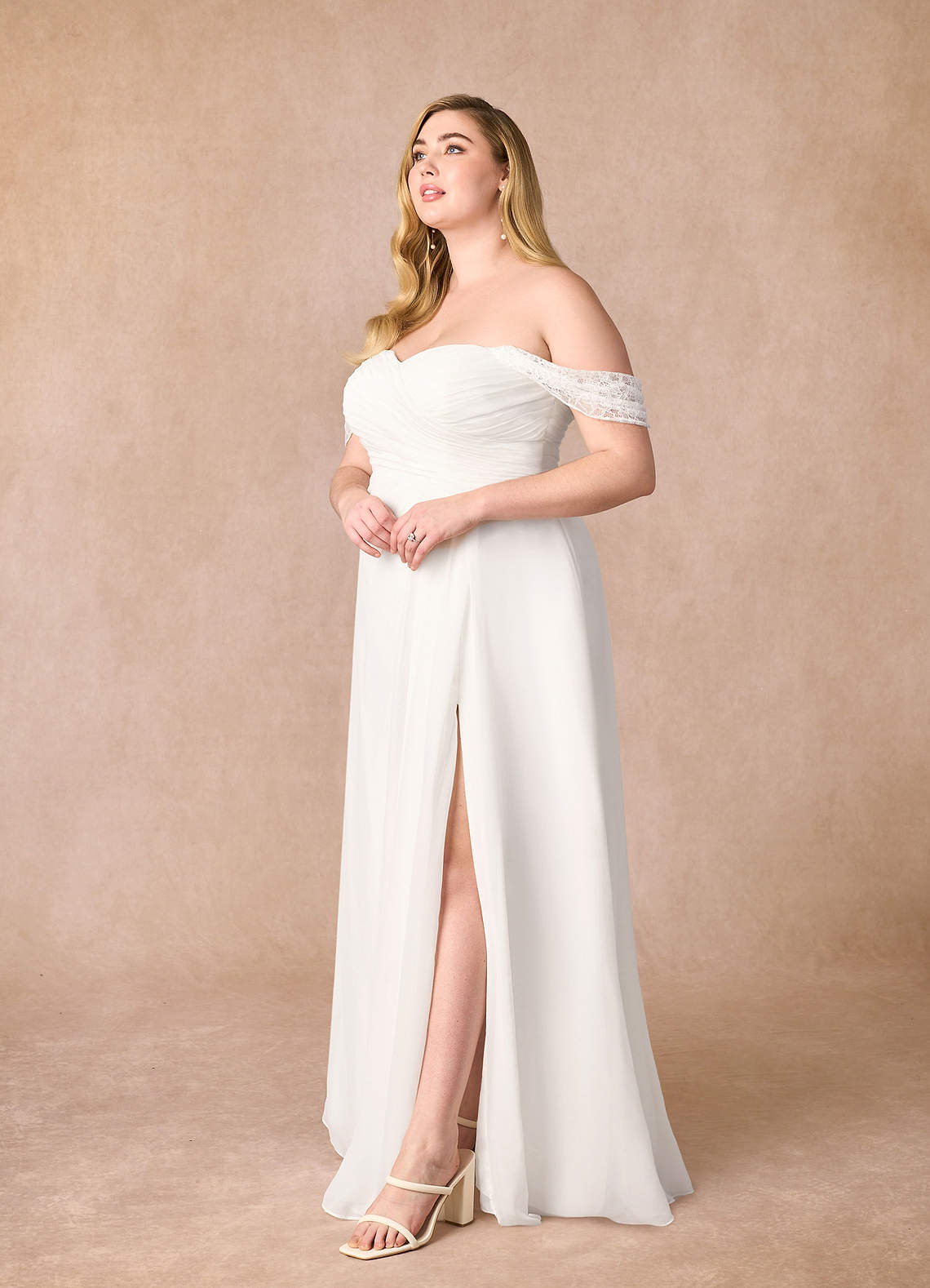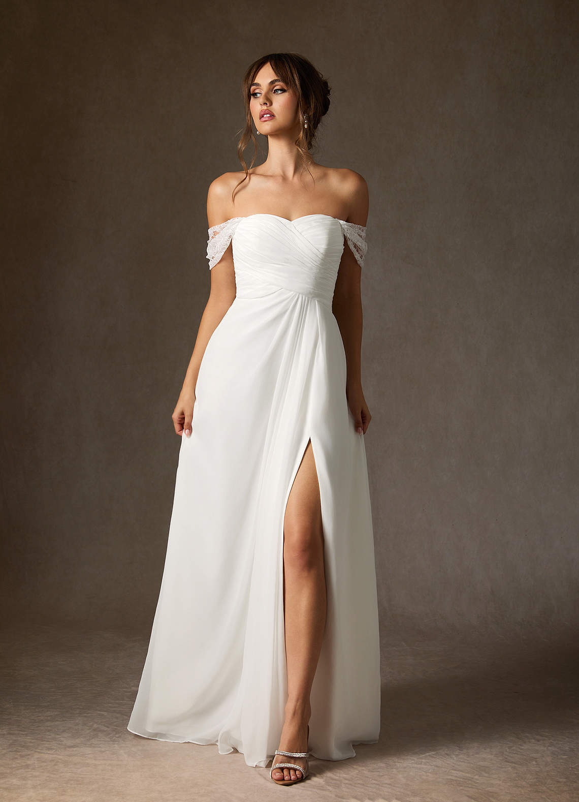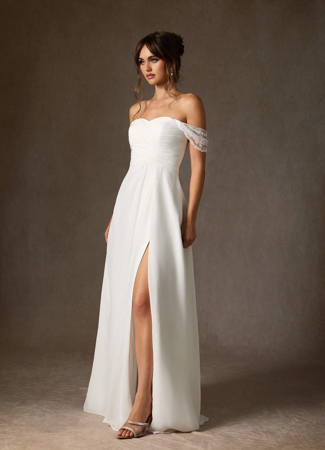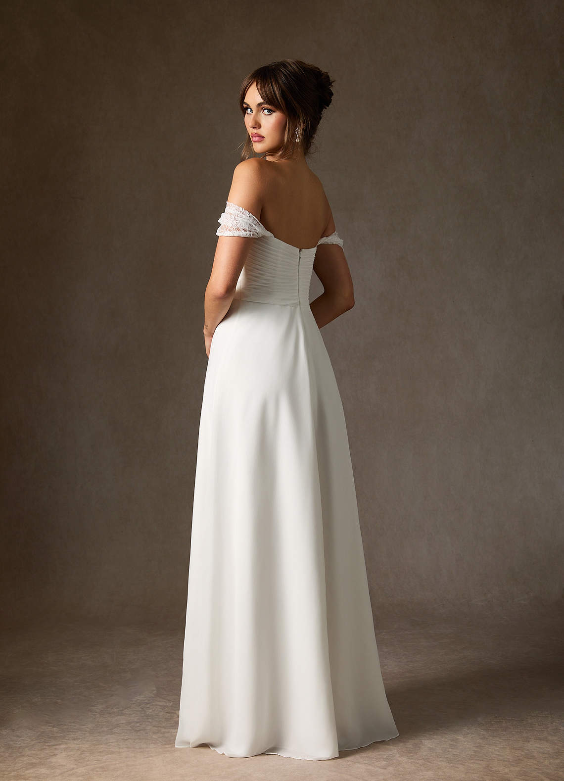 Zadie ist ein edles bodenlanges Kleid in A-Linie aus Chiffon. Es hat weiche, drapierende Falten mit einem herzförmigen Ausschnitt und einem romantischen Seitenschlitz. Ihre schulterfreien Träger aus Spitze fallen zart über Ihre Arme.